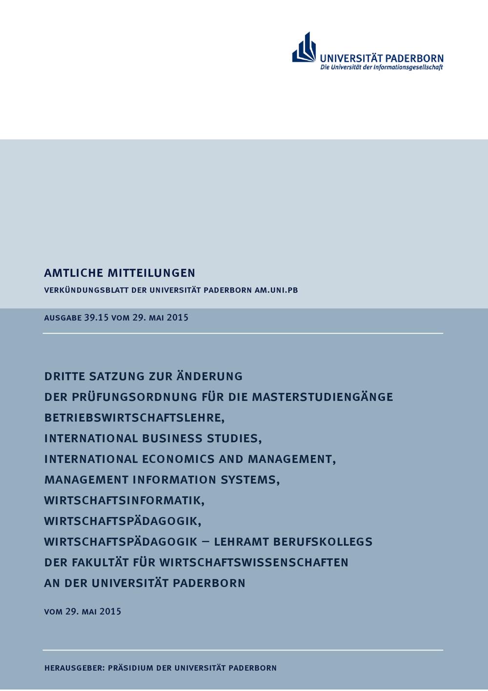 Dritte Satzung zur Änderung der Prüfungsordnung für die Masterstudiengänge Betriebswirtschaftslehre, International Business Studies, International Economics and Management, Management Information Systems, Wirtschaftsinformatik, Wirtschaftspädagogik, Wirtschaftspädagogik - Lehramt Berufskollegs der Fakultät für Wirtschaftswissenschaften an der Universität Paderborn : vom 29. Mai 2015