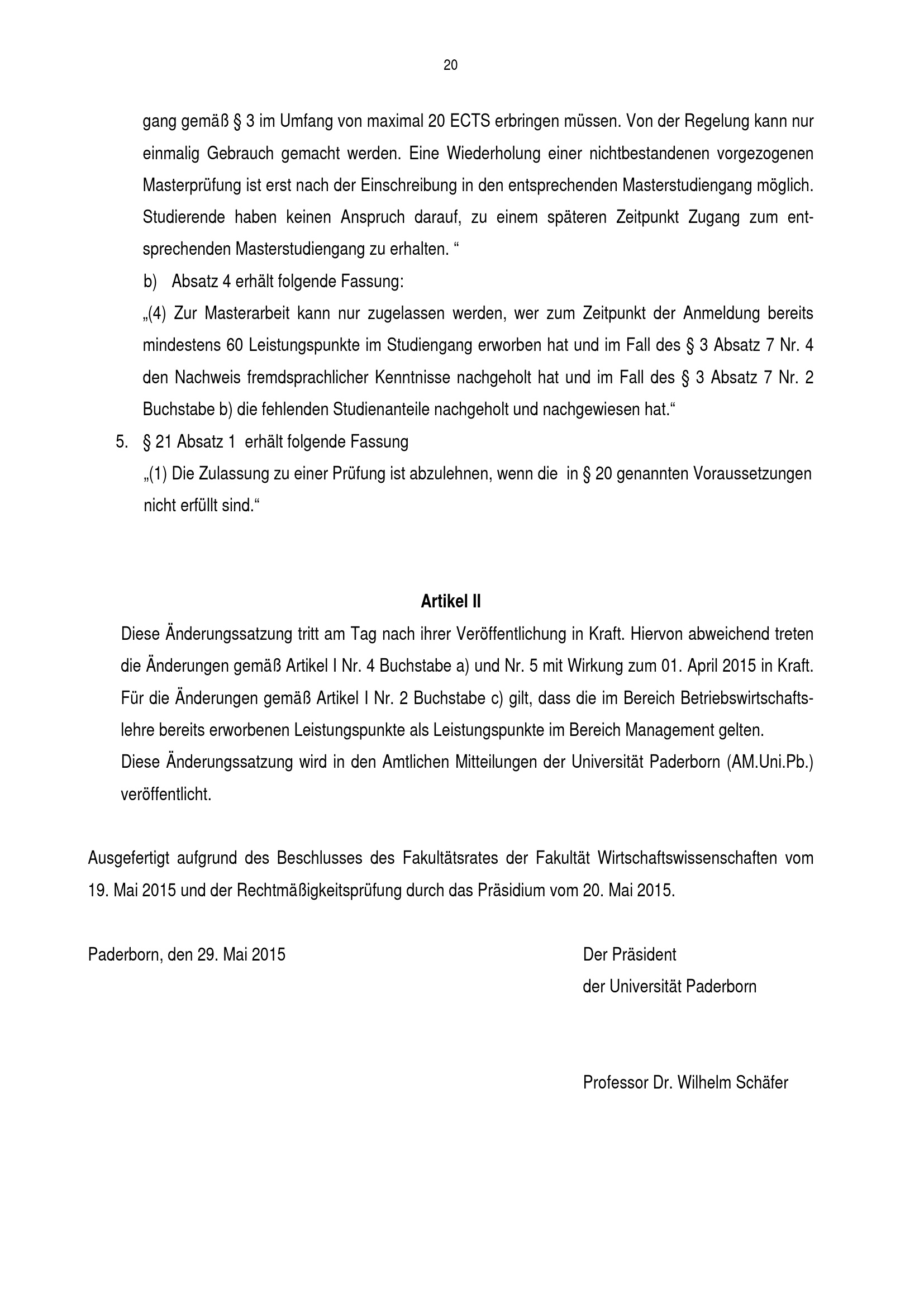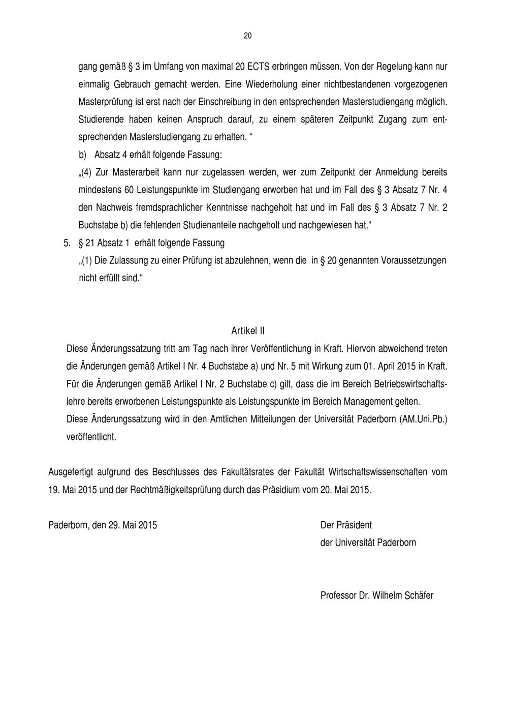 Dritte Satzung zur Änderung der Prüfungsordnung für die Masterstudiengänge Betriebswirtschaftslehre, International Business Studies, International Economics and Management, Management Information Systems, Wirtschaftsinformatik, Wirtschaftspädagogik, Wirtschaftspädagogik - Lehramt Berufskollegs der Fakultät für Wirtschaftswissenschaften an der Universität Paderborn : vom 29. Mai 2015