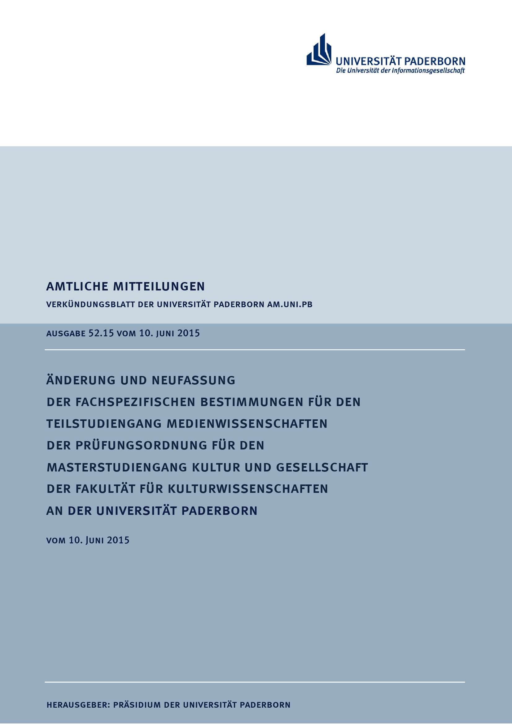 Änderung und Neufassung der fachspezifischen Bestimmungen für den Teilstudiengang Medienwissenschaften der Prüfungsordnung für den Masterstudiengang Kultur und Gesellschaft der Fakultät für Kulturwissenschaften an der Universität Paderborn : vom 10. Juni 2015