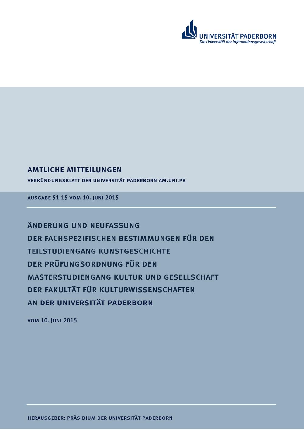 Änderung und Neufassung der fachspezifischen Bestimmungen für den Teilstudiengang Kunstgeschichte der Prüfungsordnung für den Masterstudiengang Kultur und Gesellschaft der Fakultät für Kulturwissenschaften an der Universität Paderborn : vom 10. Juni 2015