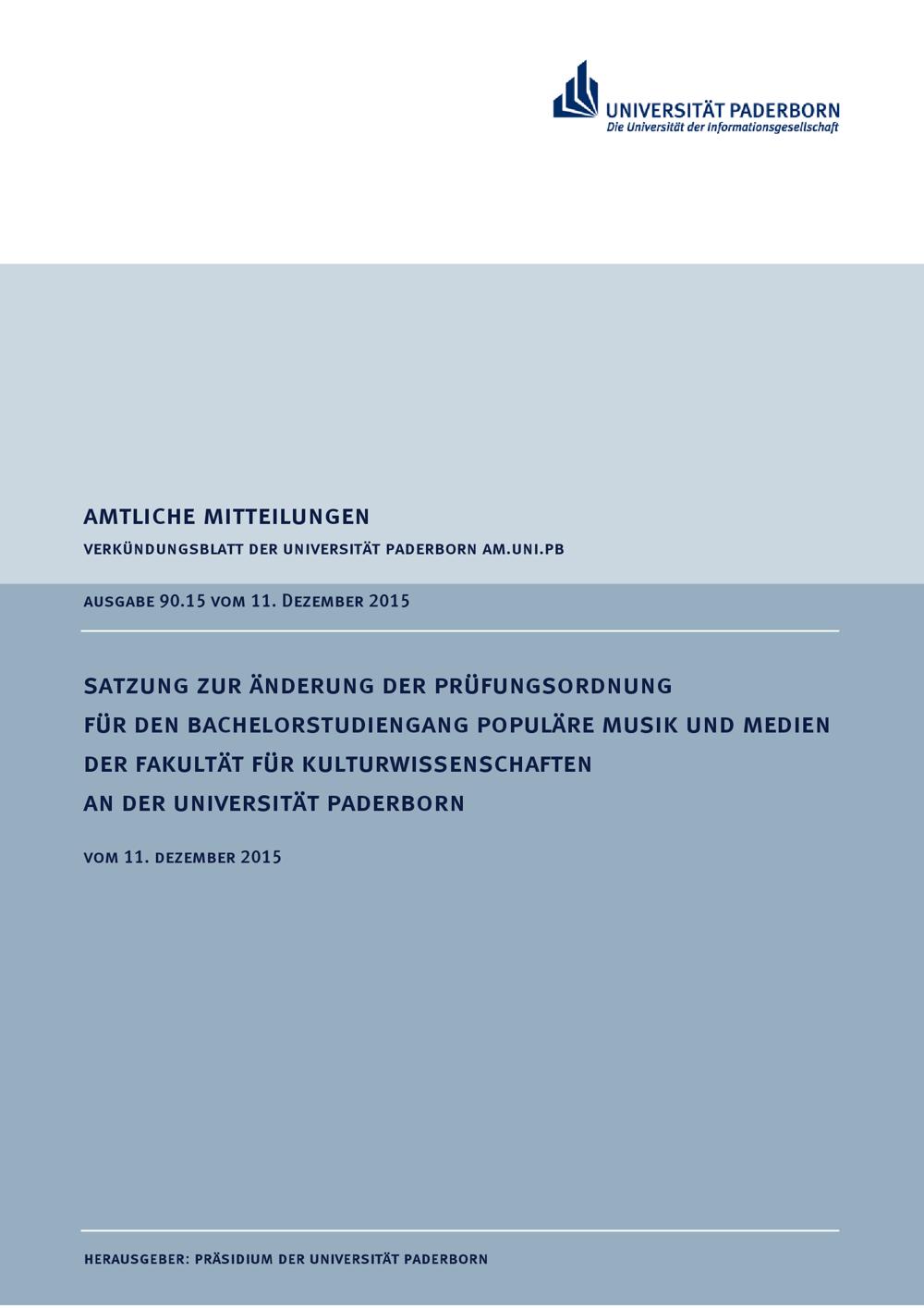 Satzung zur Änderung der Prüfungsordnung für den Bachelorstudiengang Populäre Musik und Medien der Fakultät für Kulturwissenschaften an der Universität Paderborn : vom 11. Dezember 2015