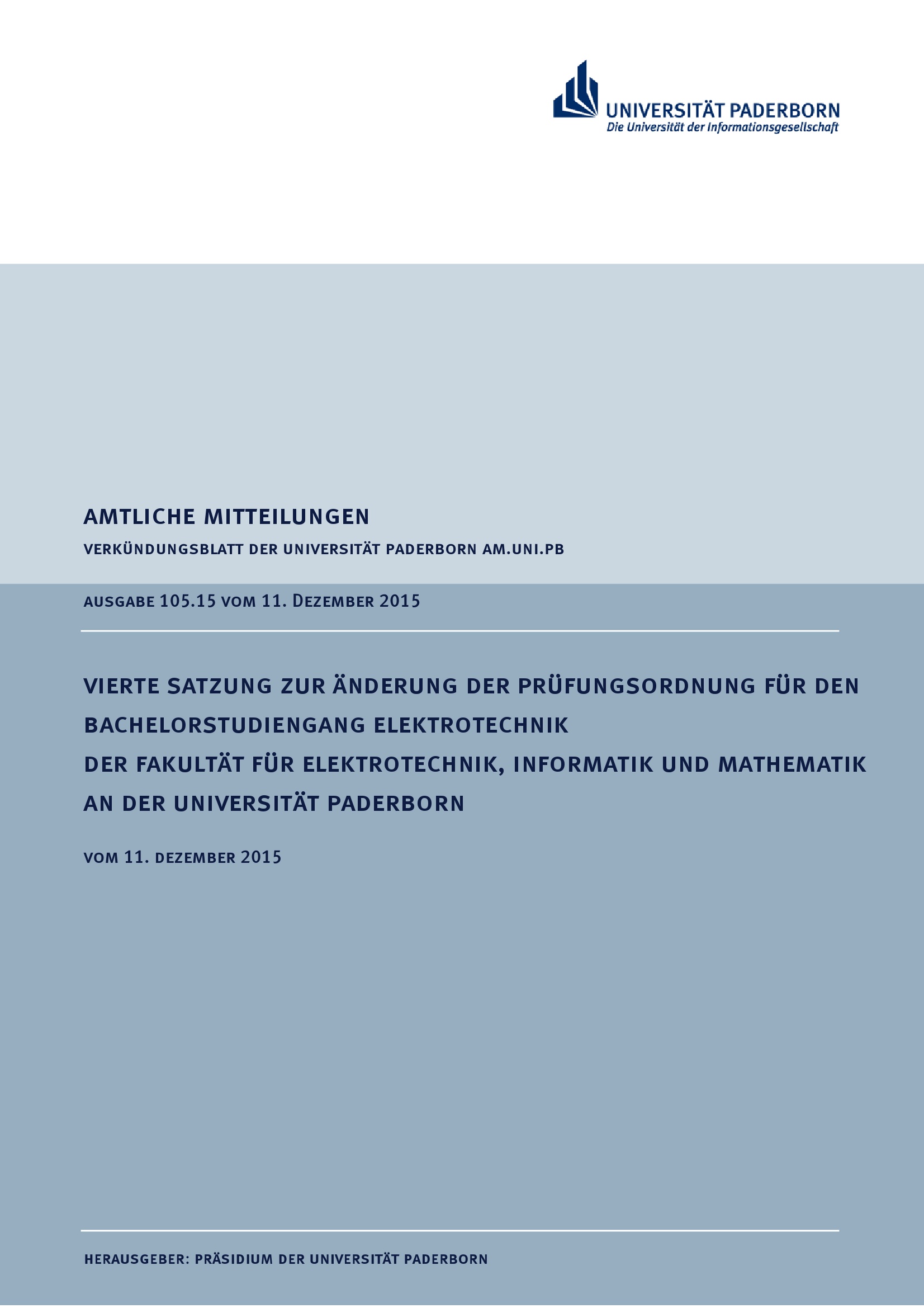 Vierte Satzung zur Änderung der Prüfungsordnung für den Bachelorstudiengang Elektrotechnik der Fakultät für Elektrotechnik, Informatik und Mathematik an der Universität Paderborn : vom 11. Dezember 2015