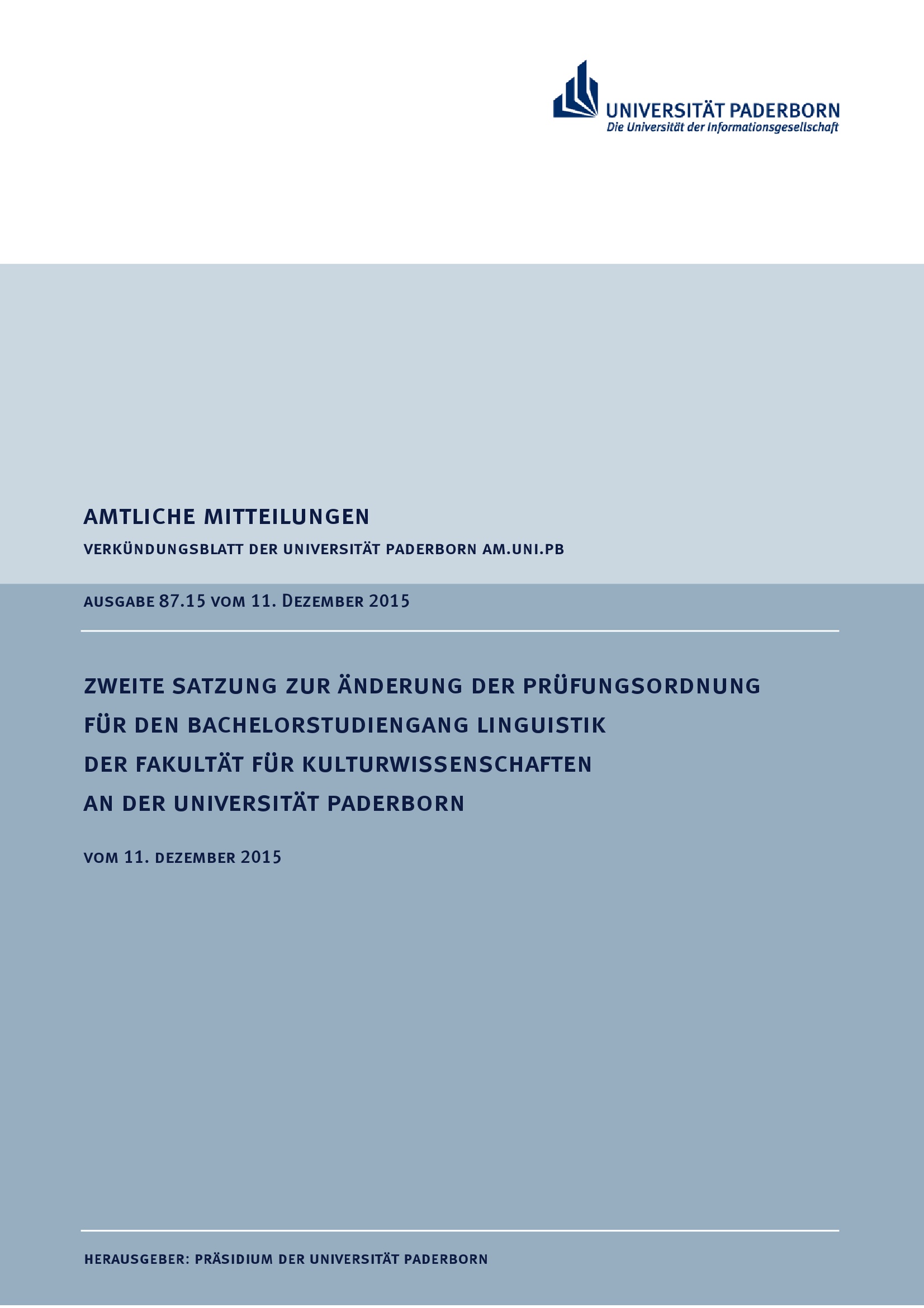 Zweite Satzung zur Änderung der Prüfungsordnung für den Bachelorstudiengang Linguistik der Fakultät für Kulturwissenschaften an der Universität Paderborn : vom 11. Dezember 2015