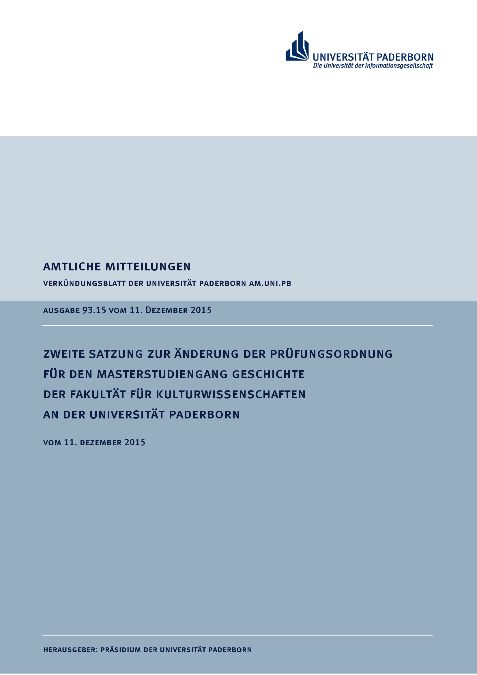 Zweite Satzung zur Änderung der Prüfungsordnung für den Masterstudiengang Geschichte der Fakultät für Kulturwissenschaften an der Universität Paderborn : vom 11. Dezember 2015