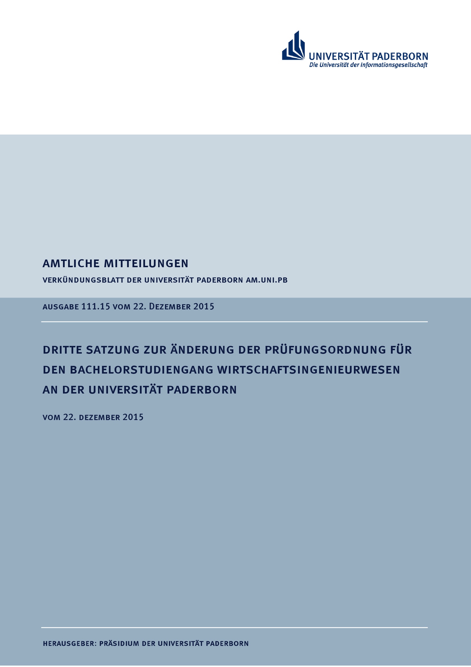 Dritte Satzung zur Änderung der Prüfungsordnung für den Bachelorstudiengang Wirtschaftsingenieurwesen an der Universität Paderborn : vom 22. Dezember 2015