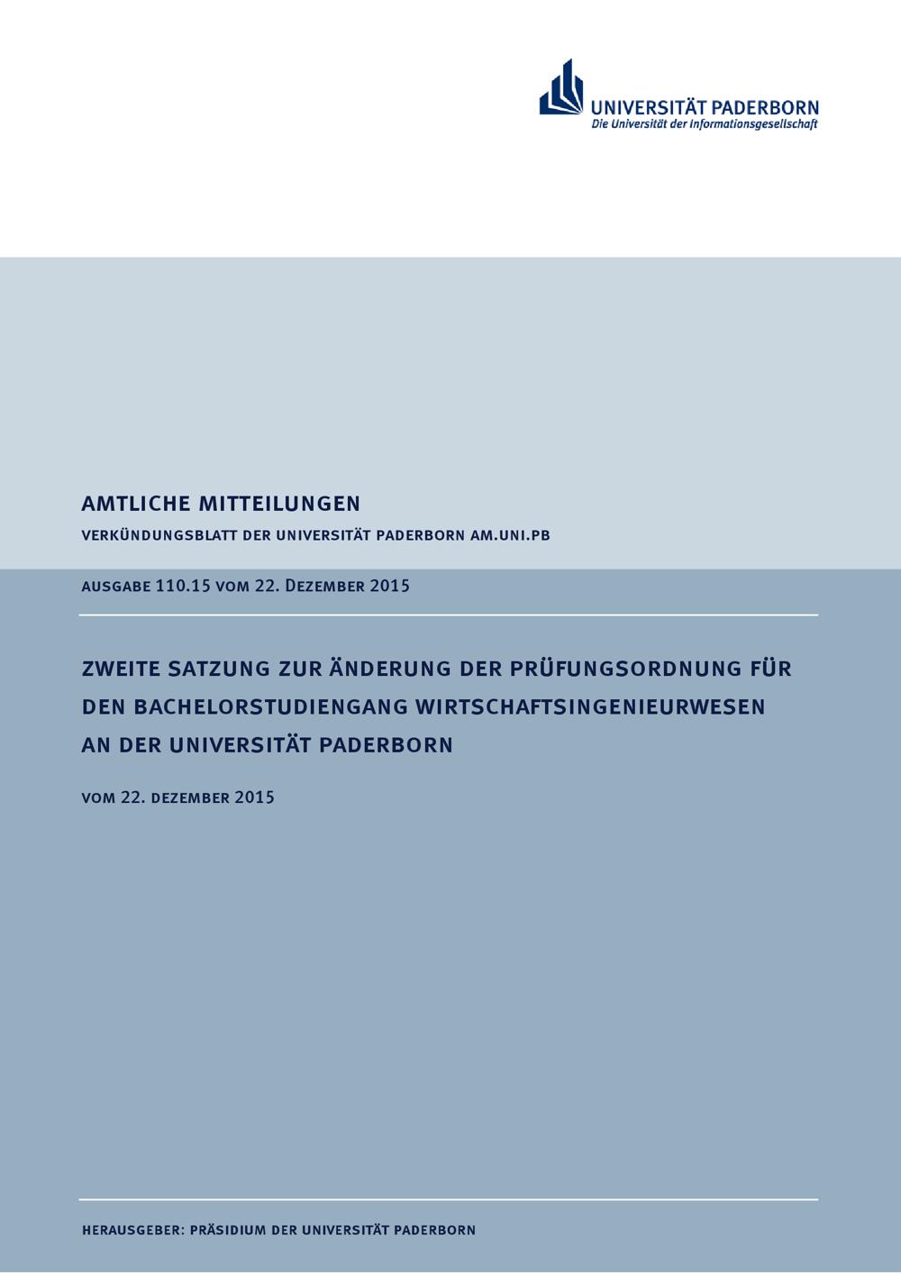 Zweite Satzung zur Änderung der Prüfungsordnung für den Bachelorstudiengang Wirtschaftsingenieurwesen an der Universität Paderborn : vom 22. Dezember 2015