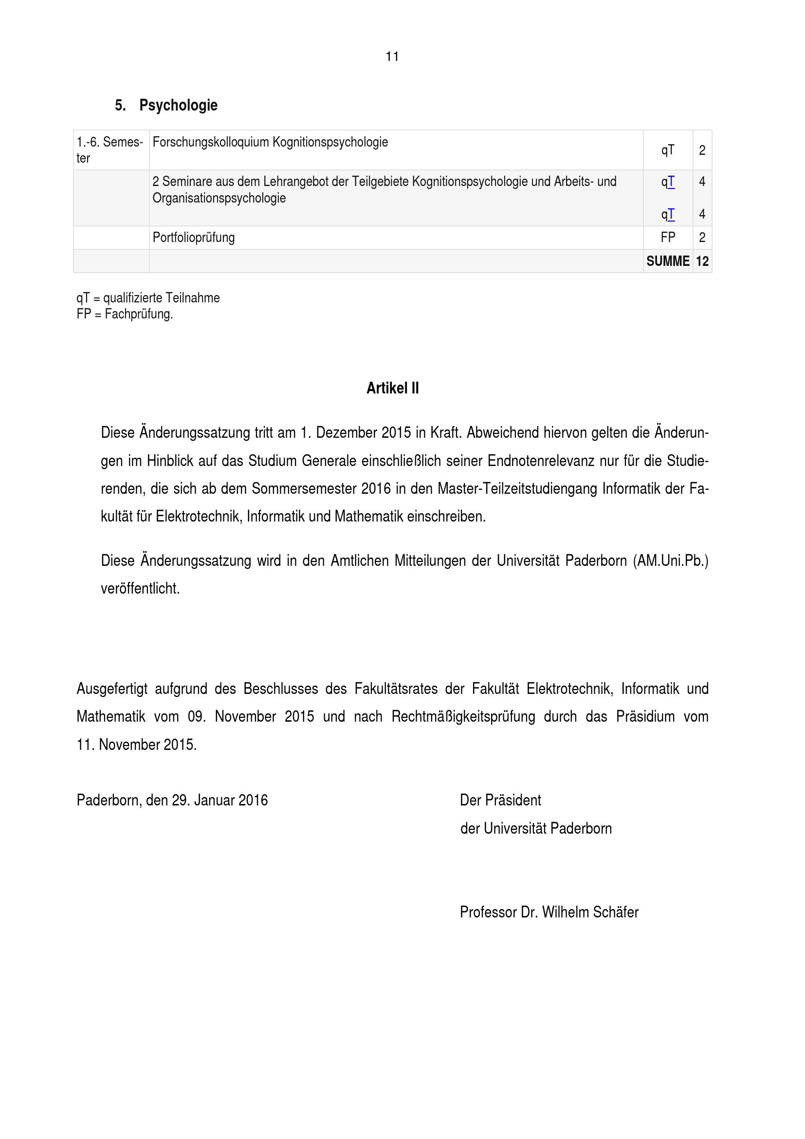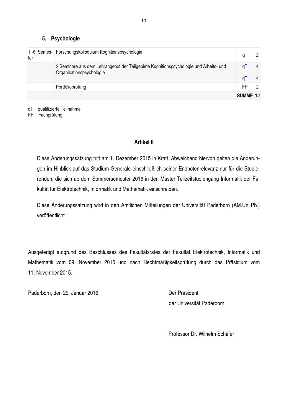 Satzung zur Änderung der Prüfungsordnung für den Master-Teilzeitstudiengang Informatik der Fakultät für Elektrotechnik, Informatik und Mathematik an der Universität Paderborn : vom 29. Januar 2016