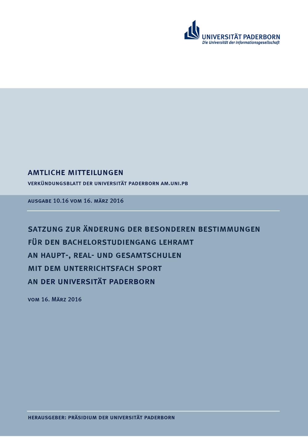Satzung zur Änderung der besonderen Bestimmungen für den Bachelorstudiengang Lehramt an Haupt-, Real- und Gesamtschulen mit dem Unterrichtsfach Sport an der Universität Paderborn : vom 16. März 2016