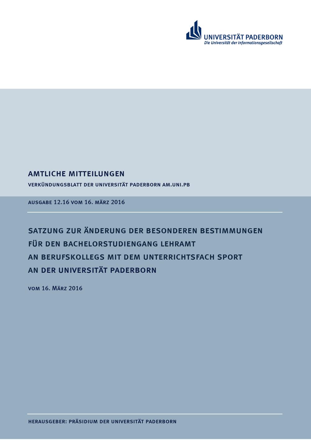 Satzung zur Änderung der besonderen Bestimmungen für den Bachelorstudiengang Lehramt an Berufskollegs mit dem Unterrichtsfach Sport an der Universität Paderborn : vom 16. März 2016