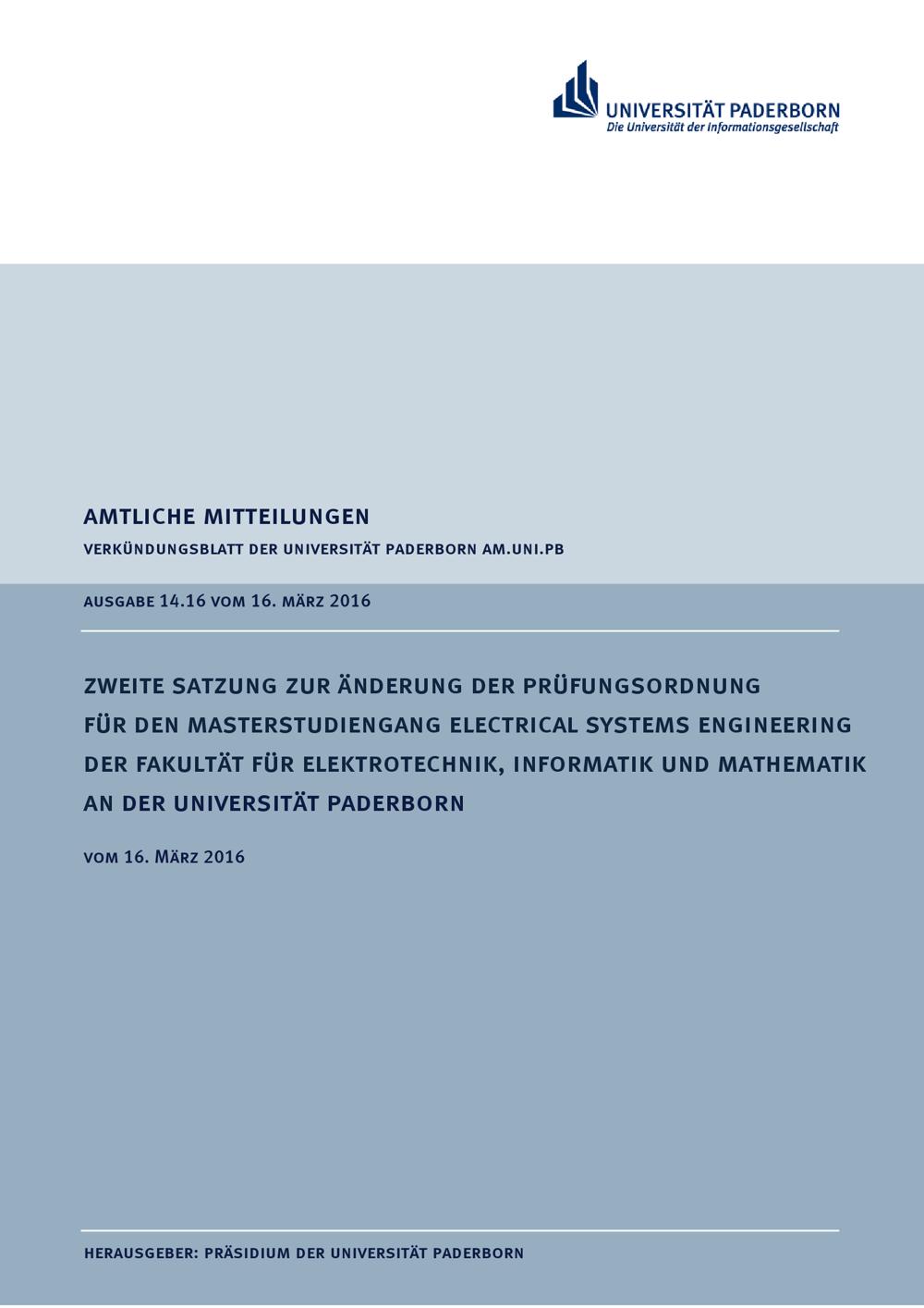 Zweite Satzung zur Änderung der Prüfungsordnung für den Masterstudiengang Electrical Systems Engineering der Fakultät für Elektrotechnik, Informatik und Mathematik an der Universität Paderborn : vom 16. März 2016