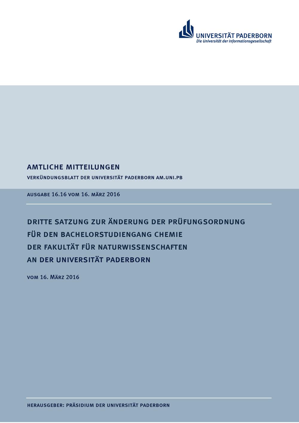 Dritte Satzung zur Änderung der Prüfungsordnung für den Bachelorstudiengang Chemie der Fakultät für Naturwissenschaften an der Universität Paderborn : vom 16. März 2016
