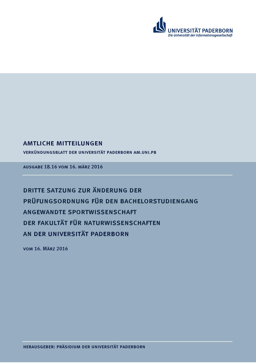 Dritte Satzung zur Änderung der Prüfungsordnung für den Bachelorstudiengang Angewandte Sportwissenschaft der Fakultät für Naturwissenschaften an der Universität Paderborn : vom 16. März 2016