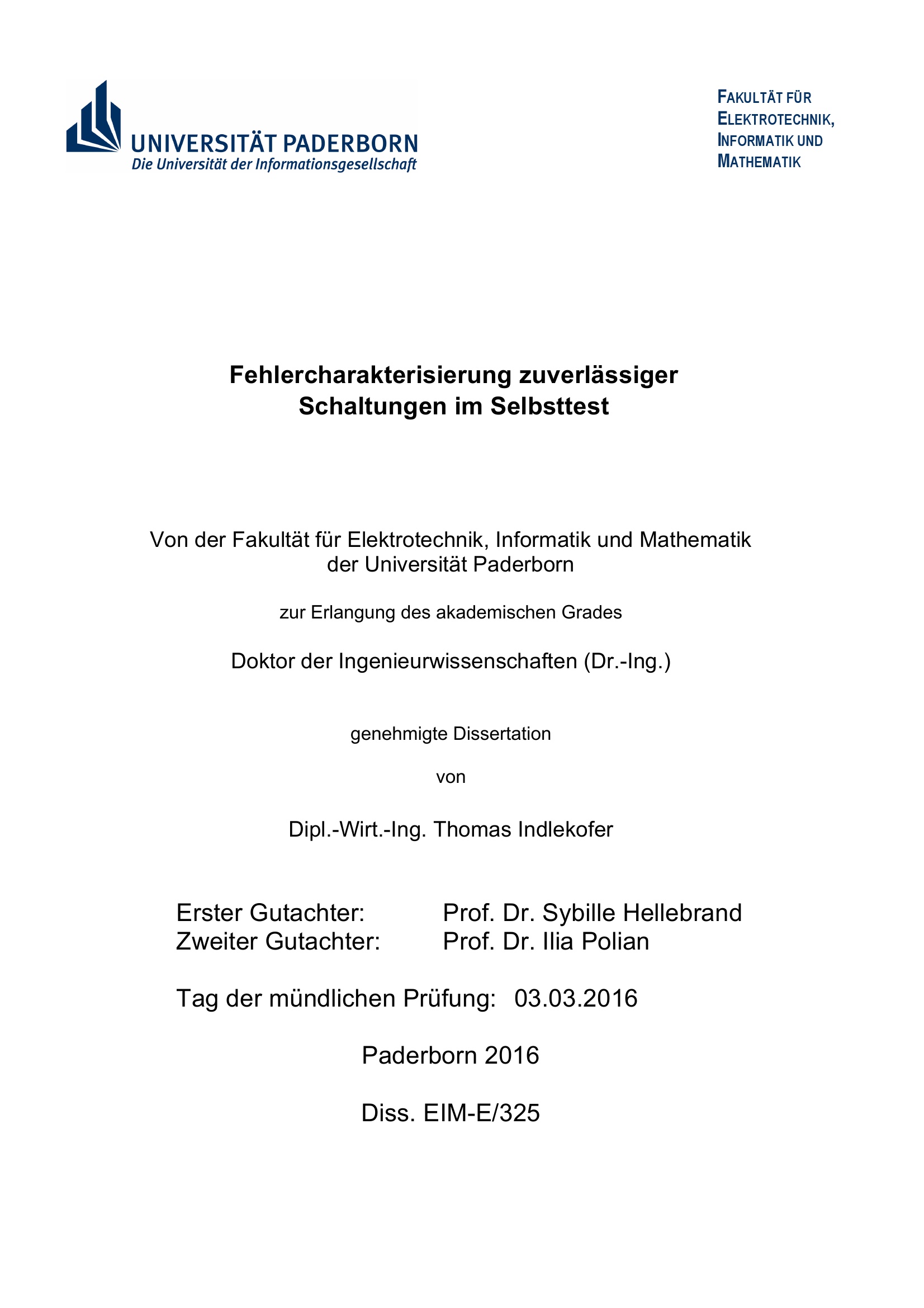 Fehlercharakterisierung zuverlässiger Schaltungen im Selbsttest / von Dipl.-Wirt.-Ing. Thomas Indlekofer ; Erster Gutachter: Prof. Dr. Sybille Hellebrand, Zweiter Gutachter: Prof. Dr. Ilia Polian