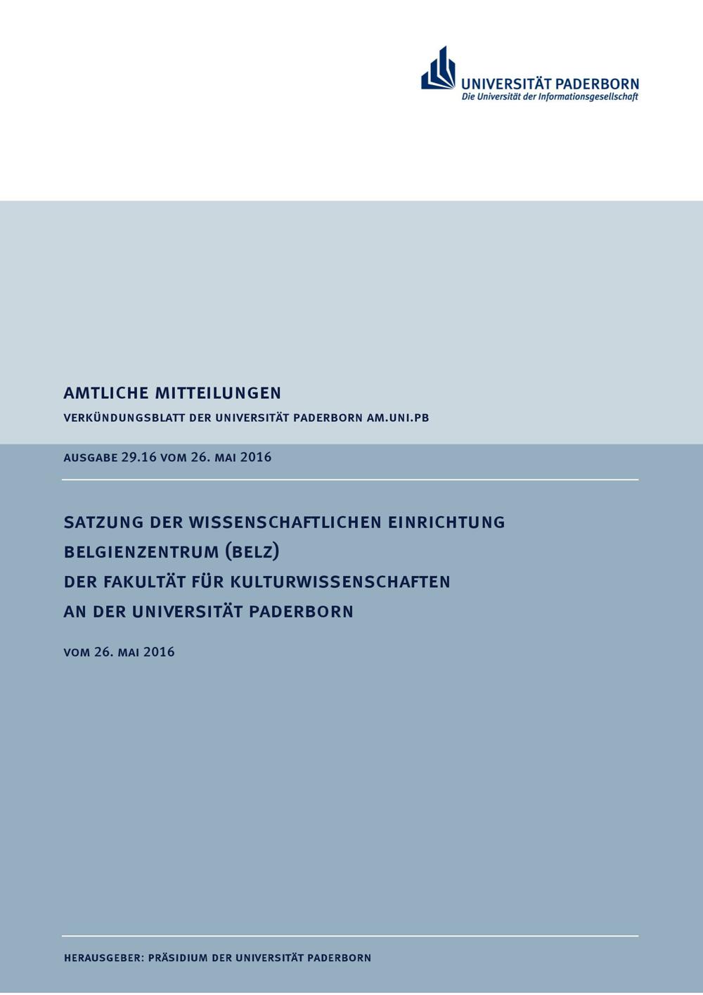 Satzung der wissenschaftlichen Einrichtung Belgienzentrum (BELZ) der Fakultät für Kulturwissenschaften an der Universität Paderborn : vom 26. Mai 2016