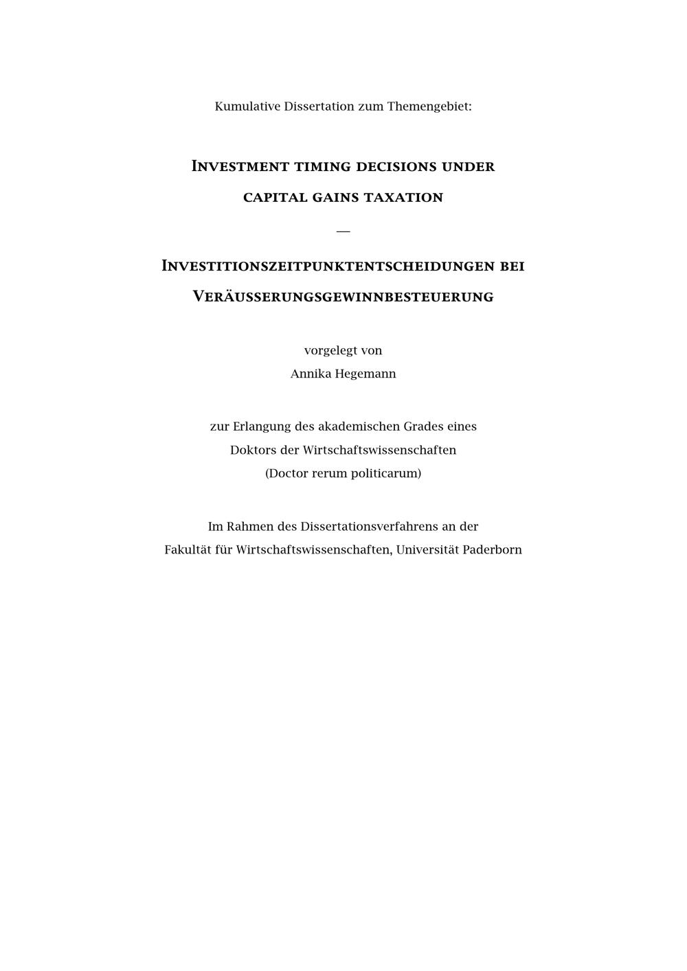 Investitionszeitpunktentscheidungen bei Veräußerungsgewinnbesteuerung / vorgelegt von Annika Hegemann