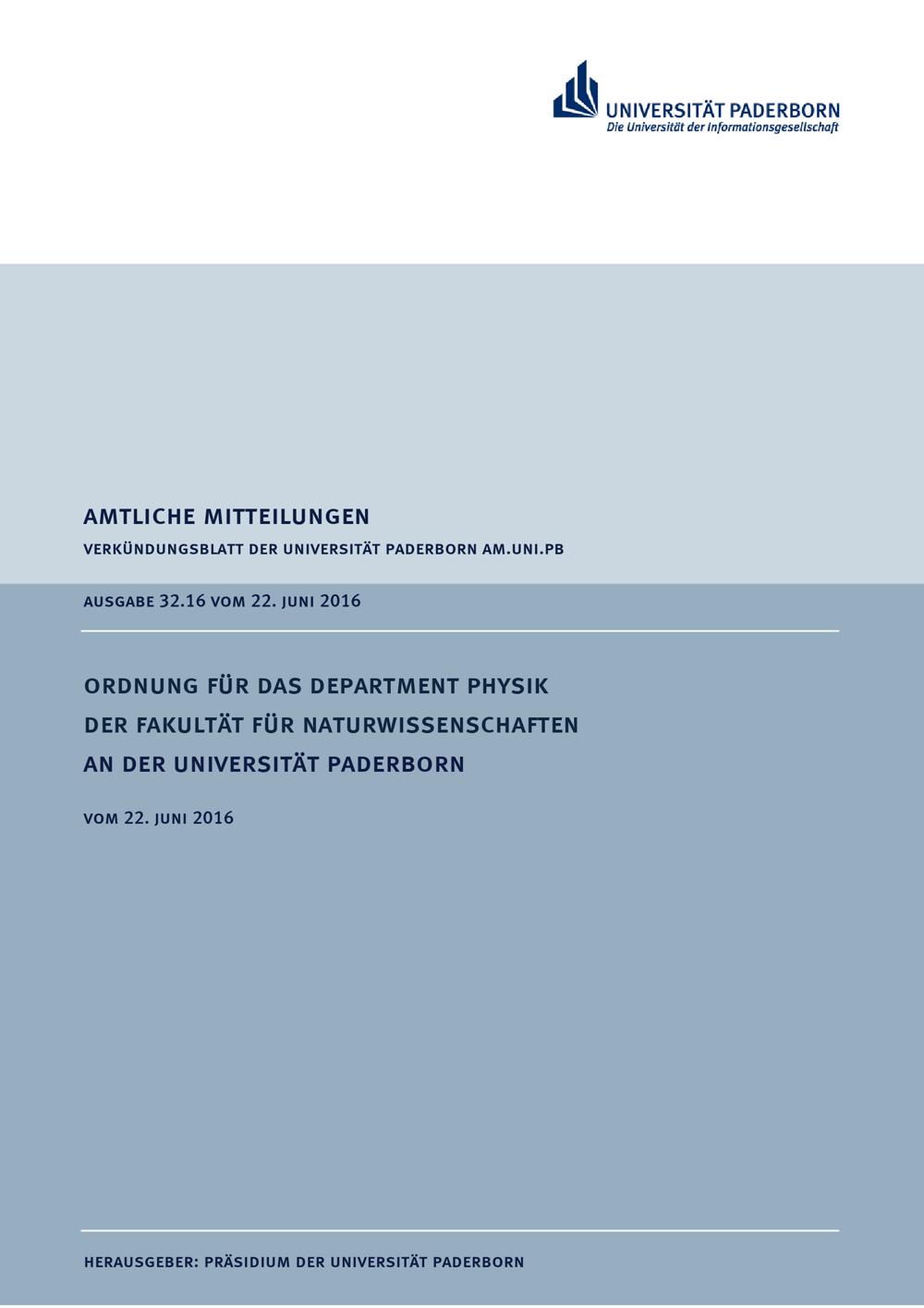 Ordnung für das Department Physik der Fakultät für Naturwissenschaften an der Universität Paderborn : vom 22. Juni 2016