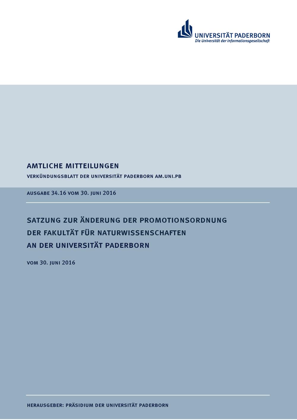 Satzung zur Änderung der Promotionsordnung der Fakultät für Naturwissenschaften an der Universität Paderborn : vom 30. juni 2016