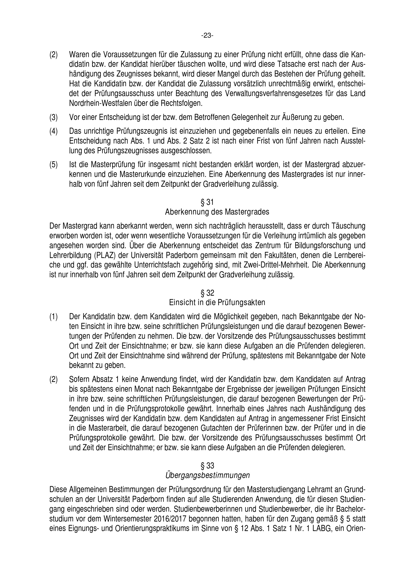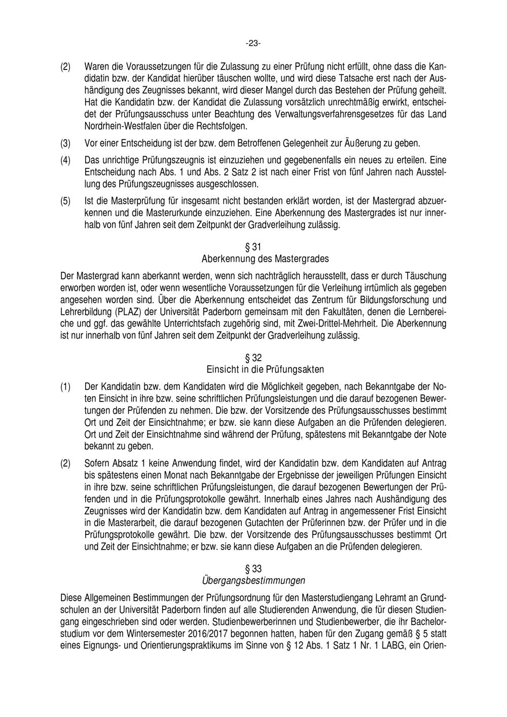Allgemeine Bestimmungen der Prüfungsordnung für den Masterstudiengang Lehramt an Grundschulen an der Universität Paderborn : vom 22. Juli 2016