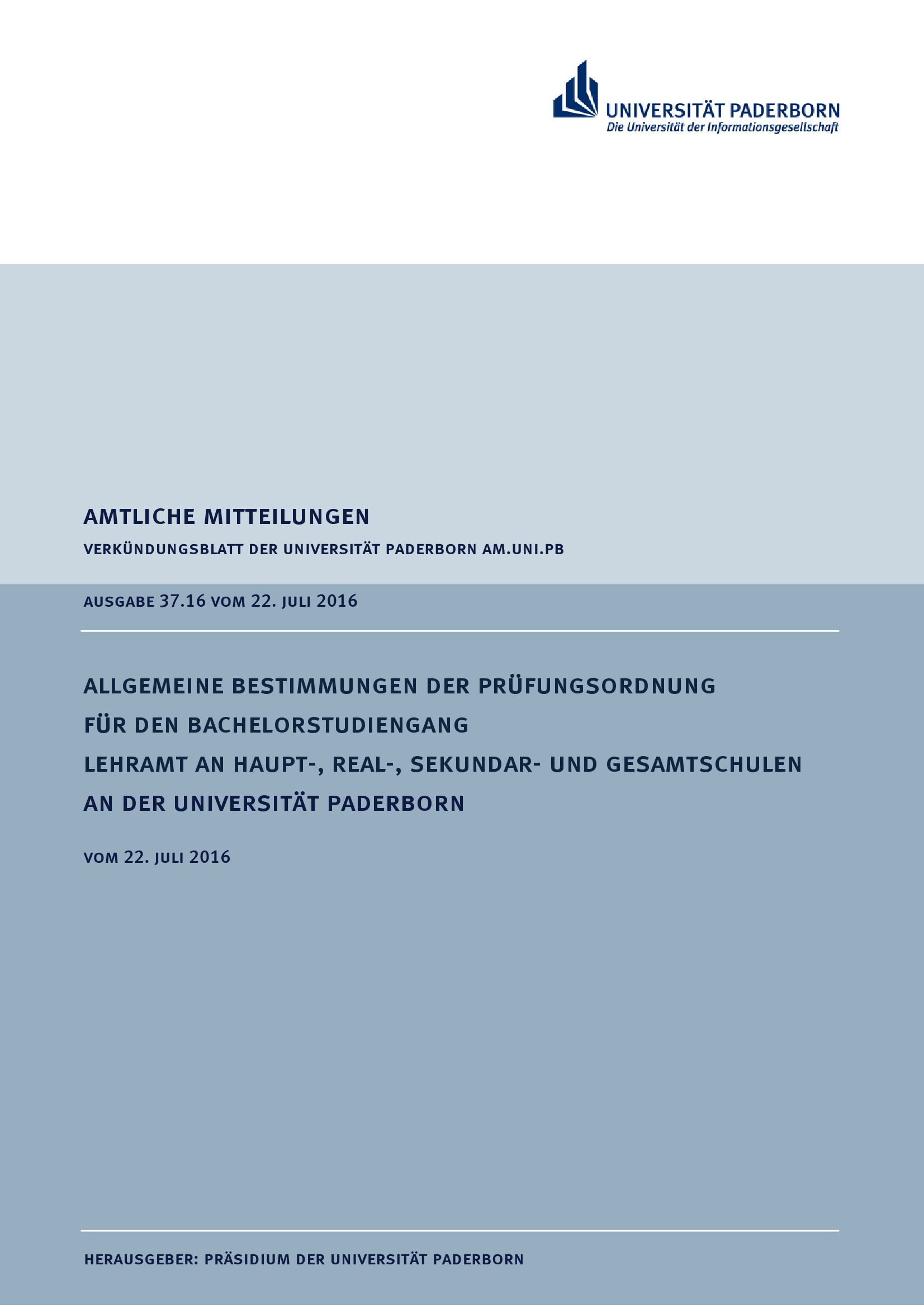 Allgemeine Bestimmungen der Prüfungsordnung für den Bachelorstudiengang Lehramt an Haupt-, Real-, Sekundar- und Gesamtschulen an der Universität Paderborn : vom 22. Juli 2016