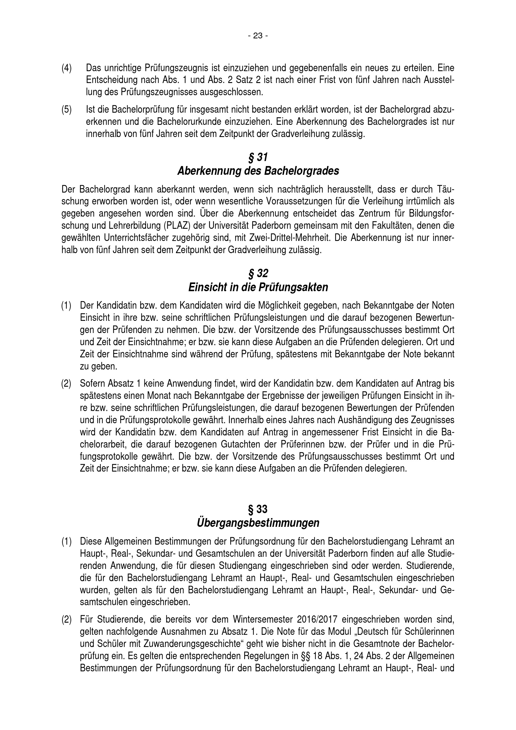 Allgemeine Bestimmungen der Prüfungsordnung für den Bachelorstudiengang Lehramt an Haupt-, Real-, Sekundar- und Gesamtschulen an der Universität Paderborn : vom 22. Juli 2016