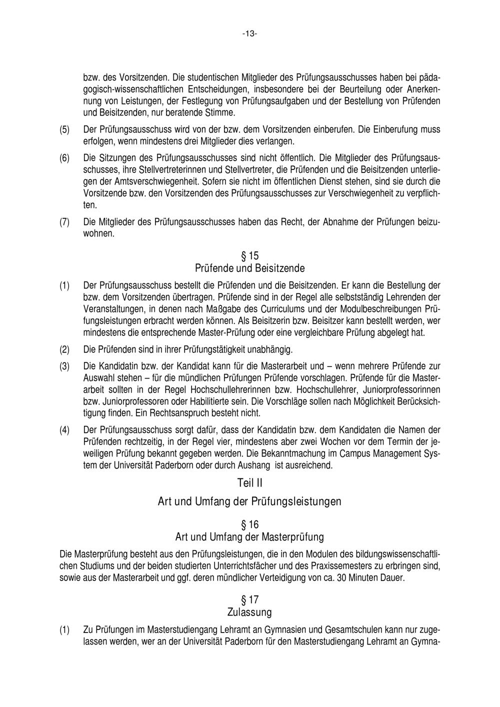 Allgemeine Bestimmungen der Prüfungsordnung für den Masterstudiengang Lehramt an Gymnasien und Gesamtschulen an der Universität Paderborn : vom 22. Juli 2016