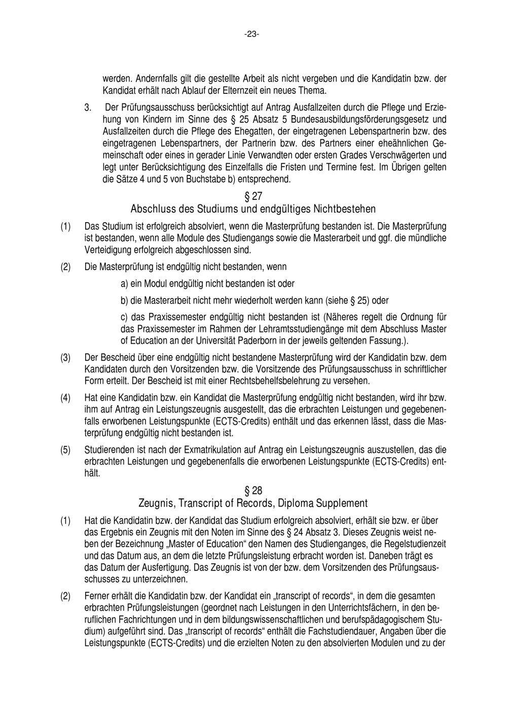 Allgemeine Bestimmungen der Prüfungsordnung für den Masterstudiengang Lehramt an Berufskollegs mit einer beruflichen Fachrichtung und einem Unterrichtsfach mit zwei beruflichen Fachrichtungen oder mit zwei Unterrichtsfächern an der Universität Paderborn : vom 22. Juli 2016