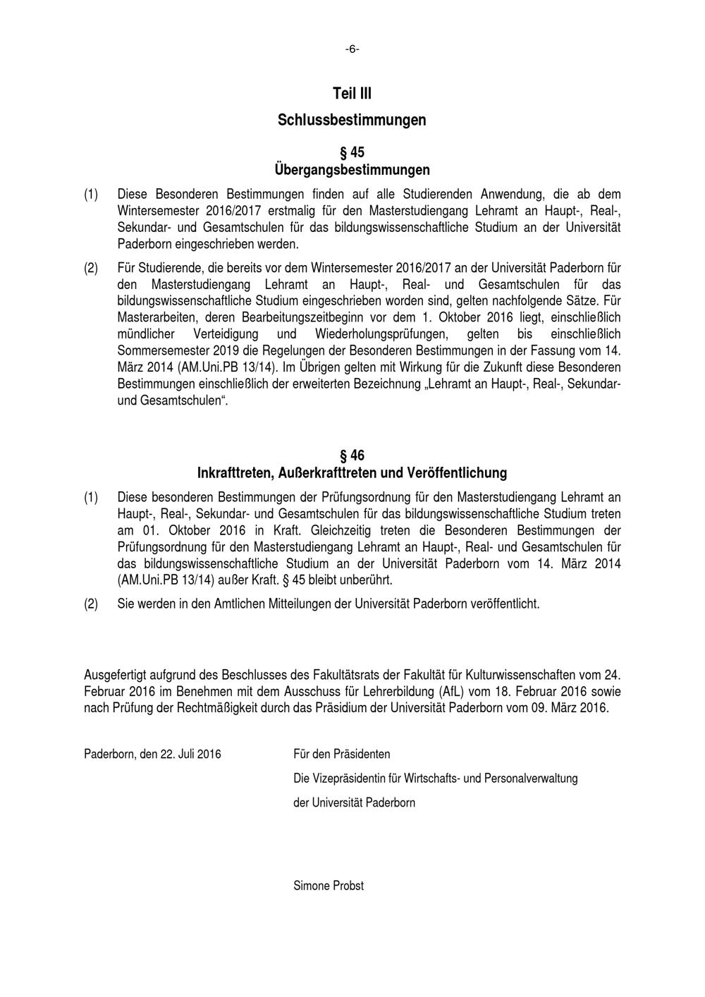 Besondere Bestimmungen der Prüfungsordnung für den Masterstudiengang Lehramt an Haupt-, Real-, Sekundar- und Gesamtschulen für das bildungswissenschaftliche Studium an der Universität Paderborn : vom 22. Juli 2016