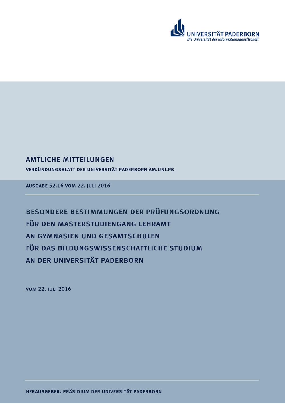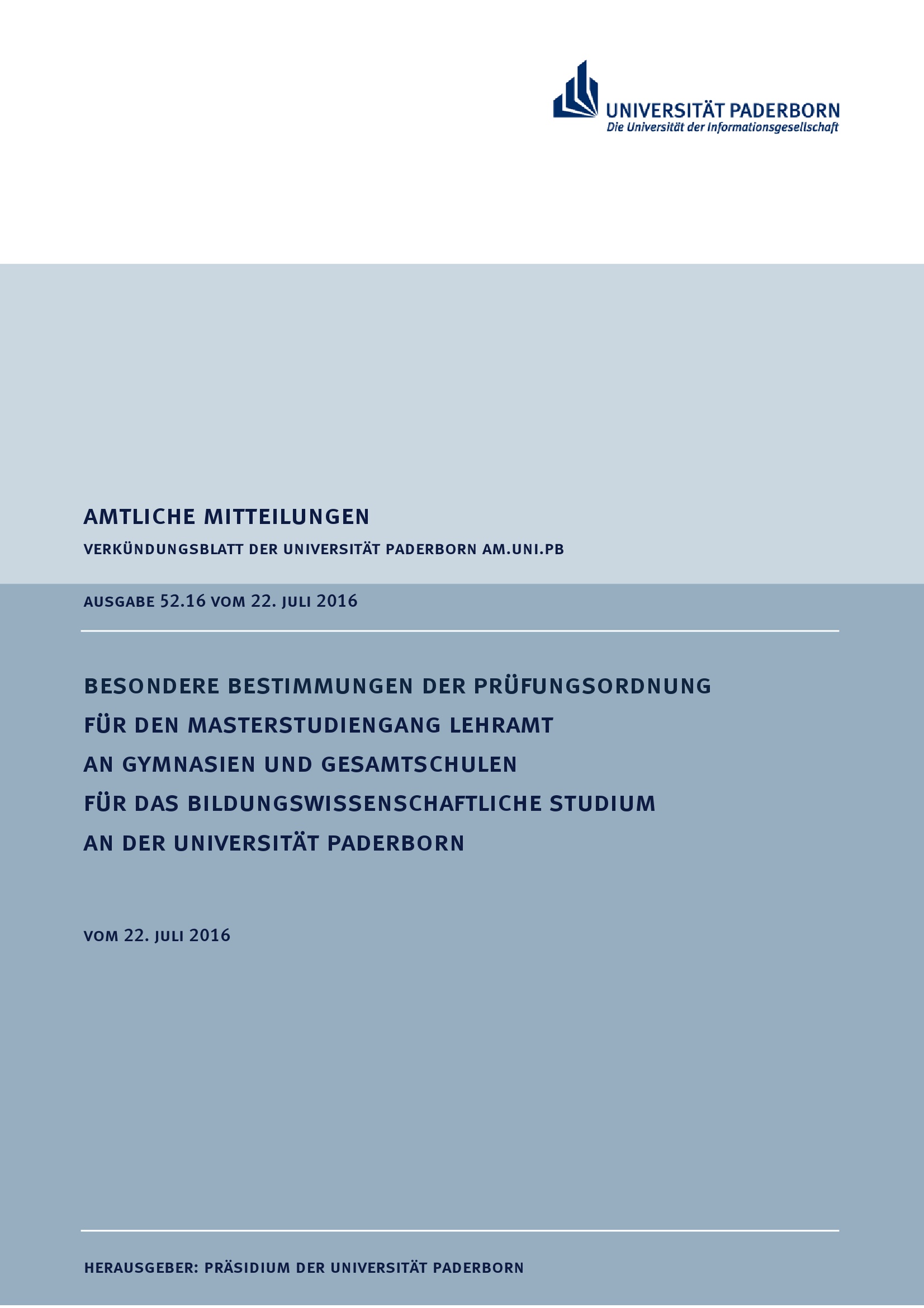 Besondere Bestimmungen der Prüfungsordnung für den Masterstudiengang Lehramt an Gymnasien und Gesamtschulen für das bildungswissenschaftliche Studium an der Universität Paderborn : vom 22. Juli 2016