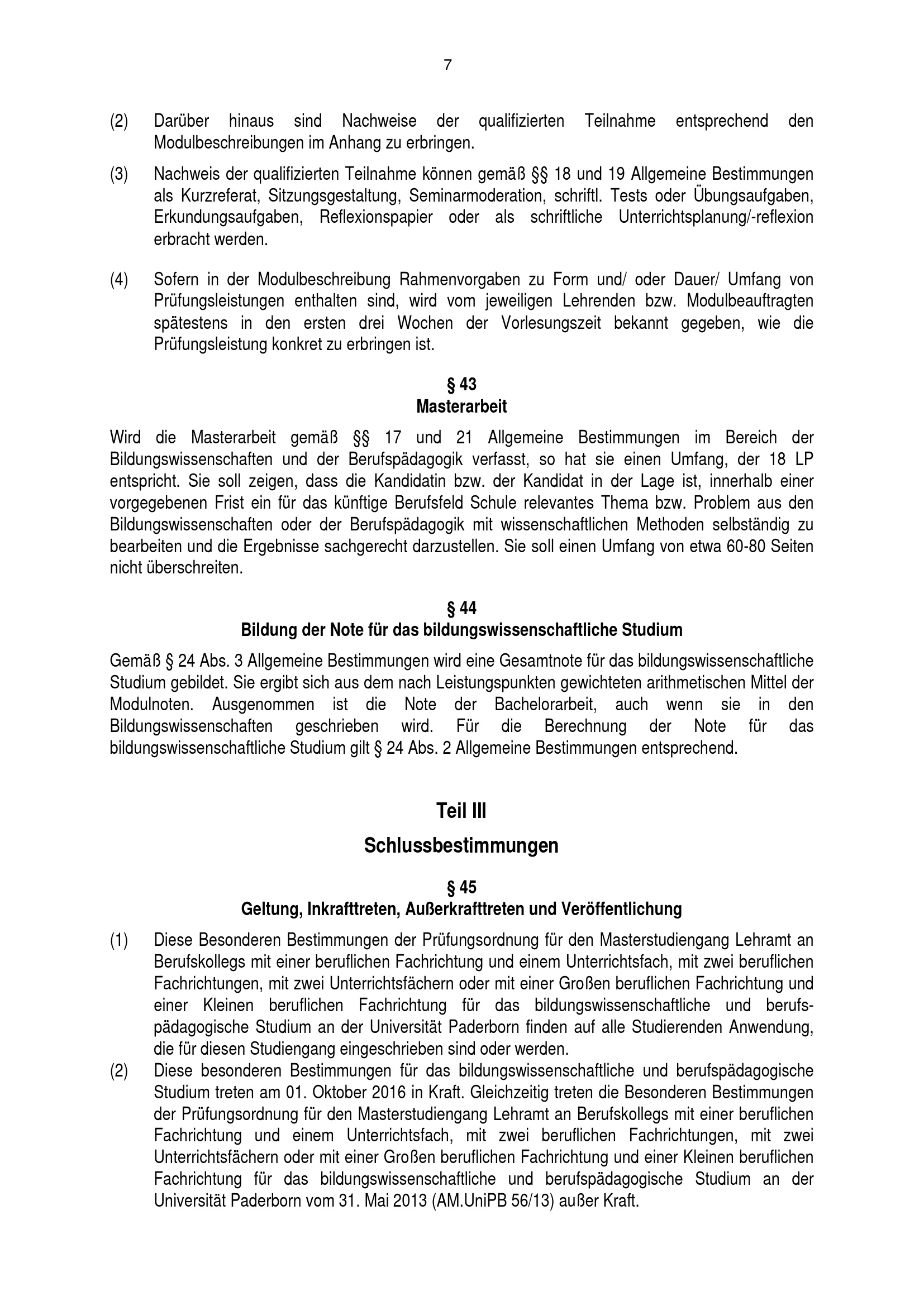 Besondere Bestimmungen der Prüfungsordnung für den Masterstudiengang Lehramt an Berufskollegs mit einer beruflichen Fachrichtung und einem Unterrichtsfach, mit zwei beruflichen Fachrichtungen, mit zwei Unterrichtsfächern oder mit einer großen beruflichen Fachrichtung und einer kleinen beruflichen Fachrichtung für das bildungswissenschaftliche und berufspädagogische Studium an der Universität Paderborn : vom 22. Juli 2016