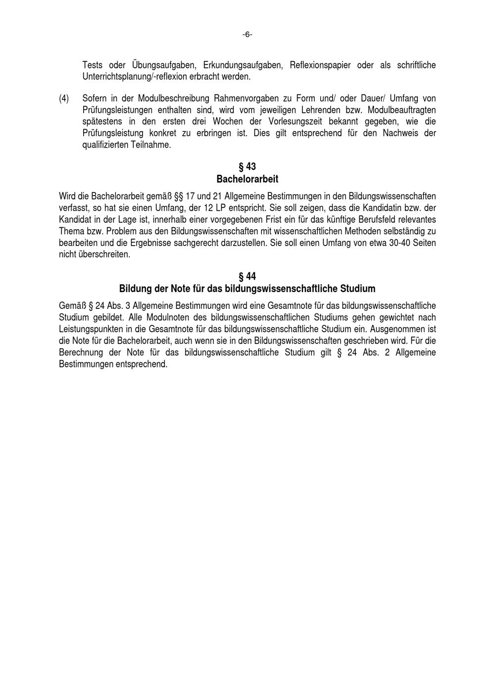 § 44 Bildung der Note für das bildungswissenschaftliche Studium