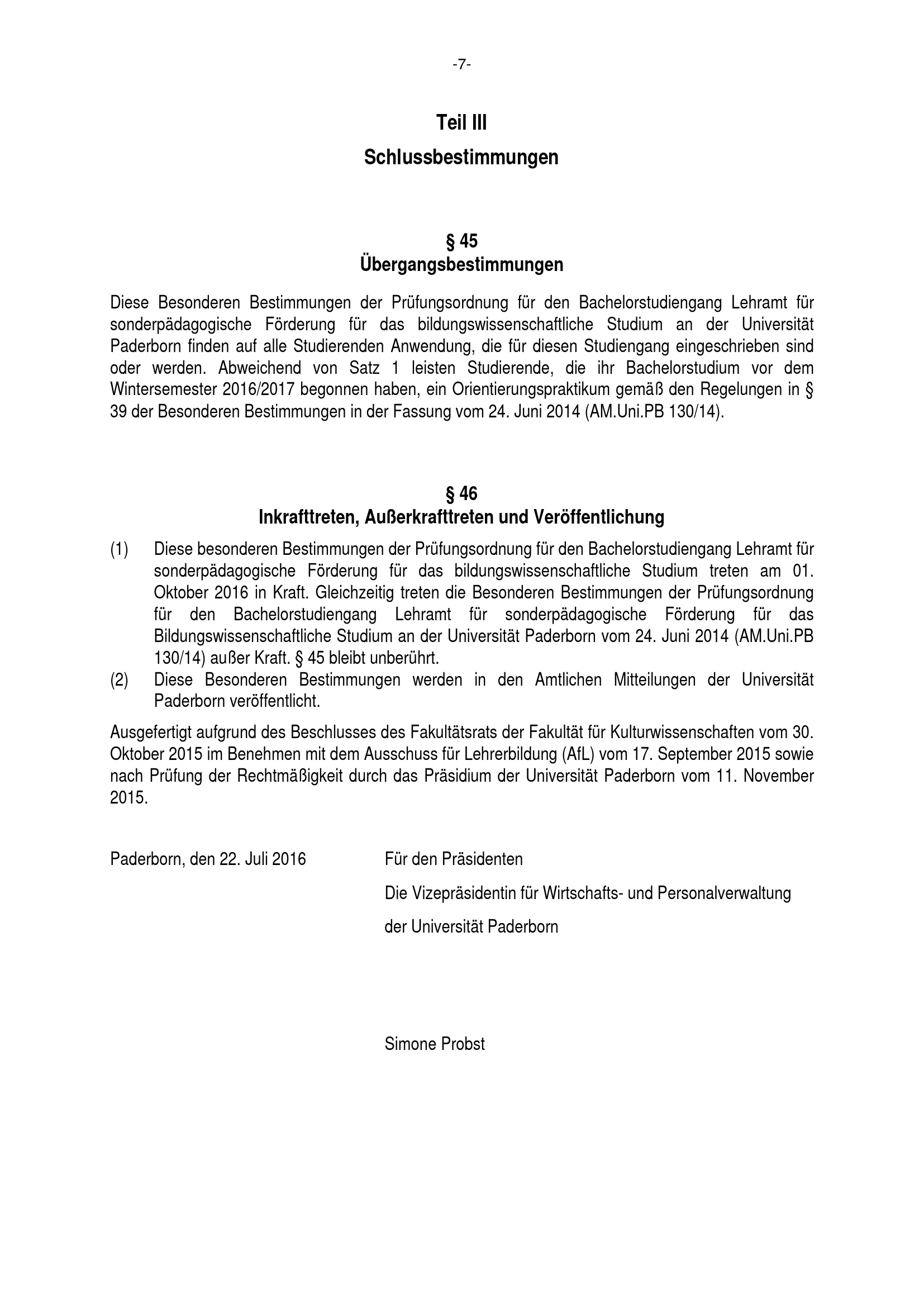 Besondere Bestimmungen der Prüfungsordnung für den Bachelorstudiengang Lehramt für sonderpädagogische Förderung für das bildungswissenschaftliche Studium an der Universität Paderborn : vom 22. Juli 2016