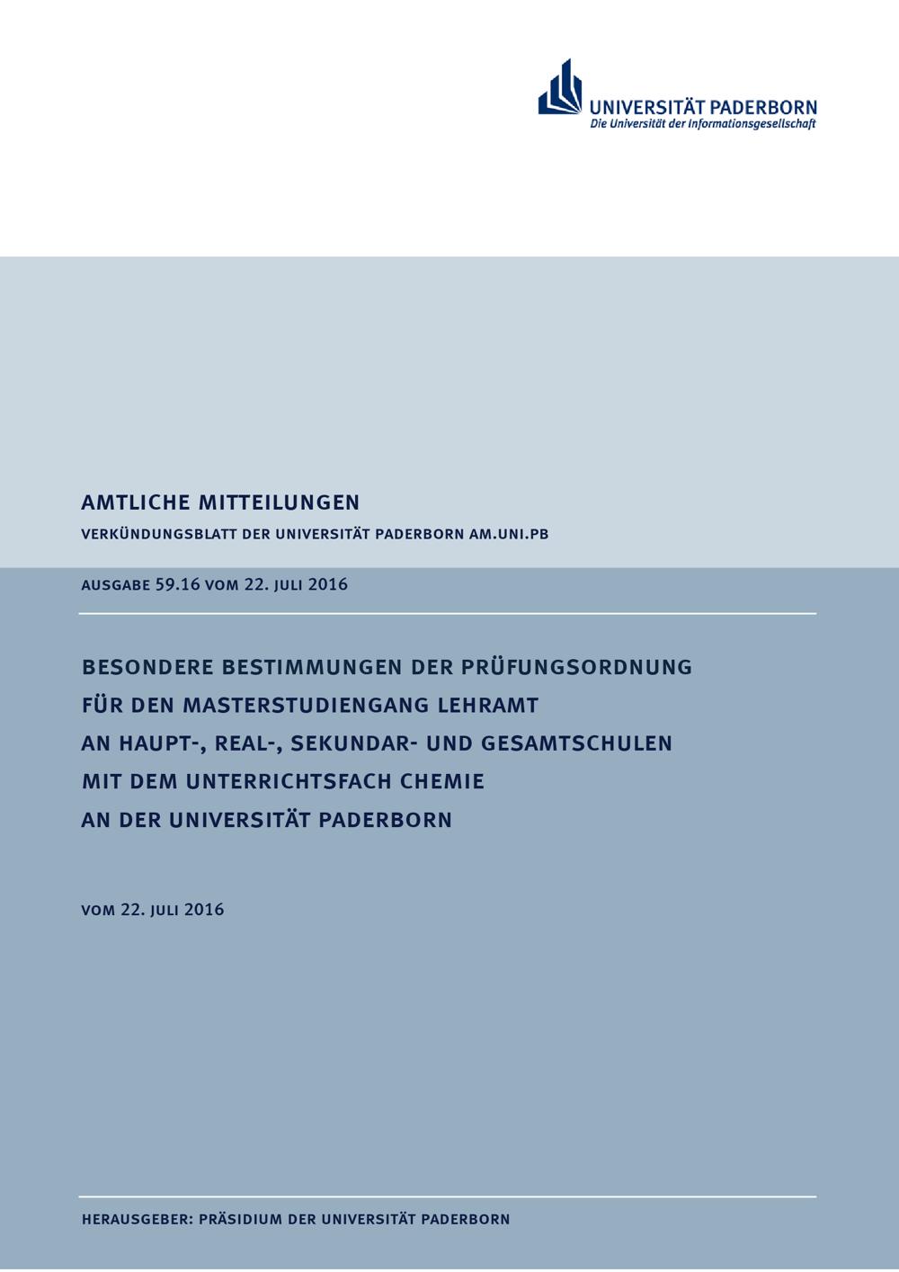 Besondere Bestimmungen der Prüfungsordnung für den Masterstudiengang Lehramt an Haupt-, Real-, Sekundar- und Gesamtschulen mit dem Unterrichtsfach Chemie an der Universität Paderborn : vom 22. Juli 2016