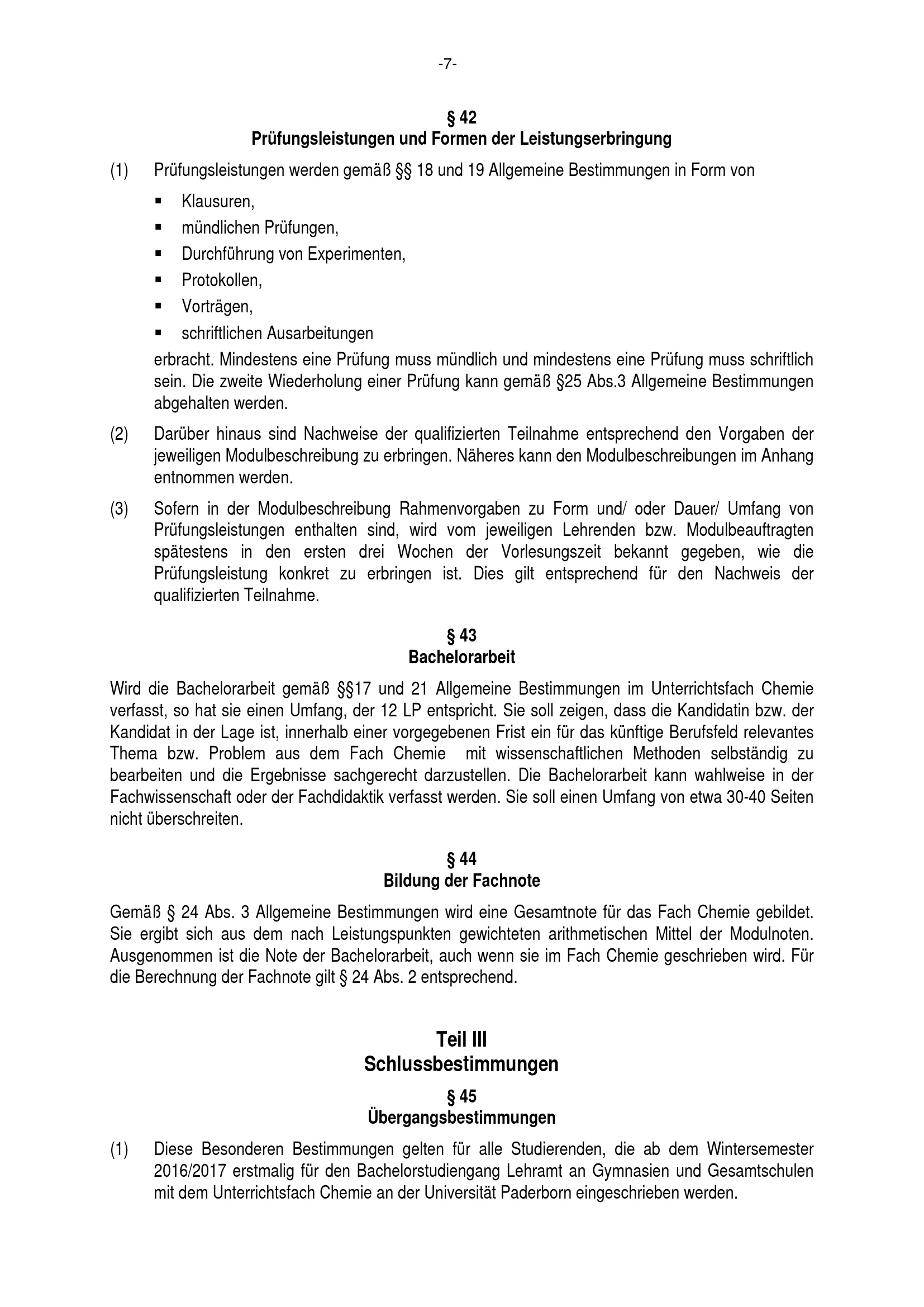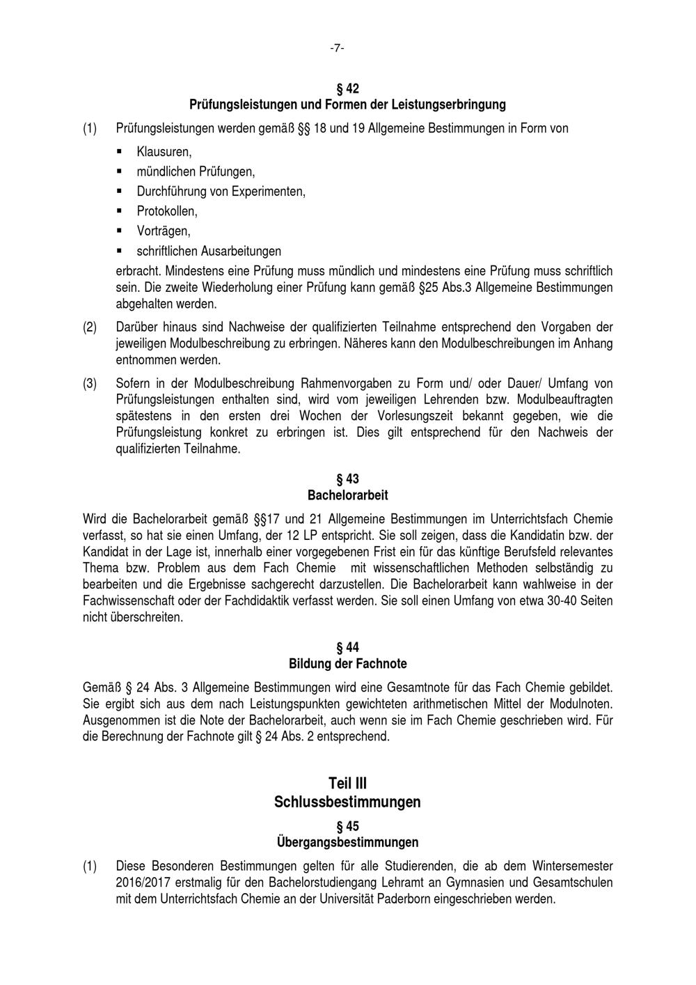 Besondere Bestimmungen der Prüfungsordnung für den Bachelorstudiengang Lehramt an Gymnasien und Gesamtschulen mit dem Unterrichtsfach Chemie an der Universität Paderborn : vom 22. Juli 2016