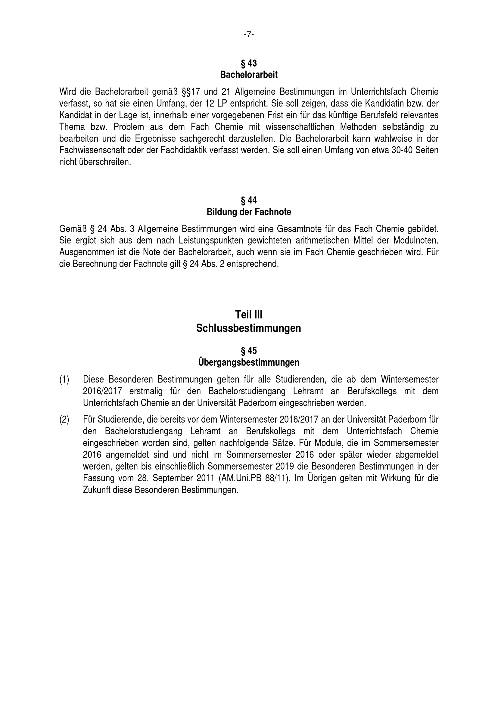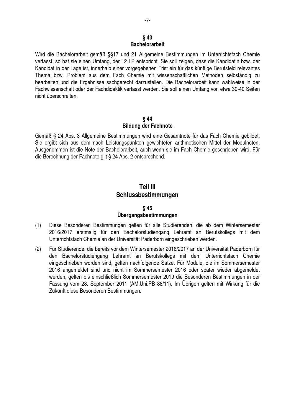 Besondere Bestimmungen der Prüfungsordnung für den Bachelorstudiengang Lehramt an Berufskollegs mit dem Unterrichtsfach Chemie an der Universität Paderborn : vom 22. Juli 2016