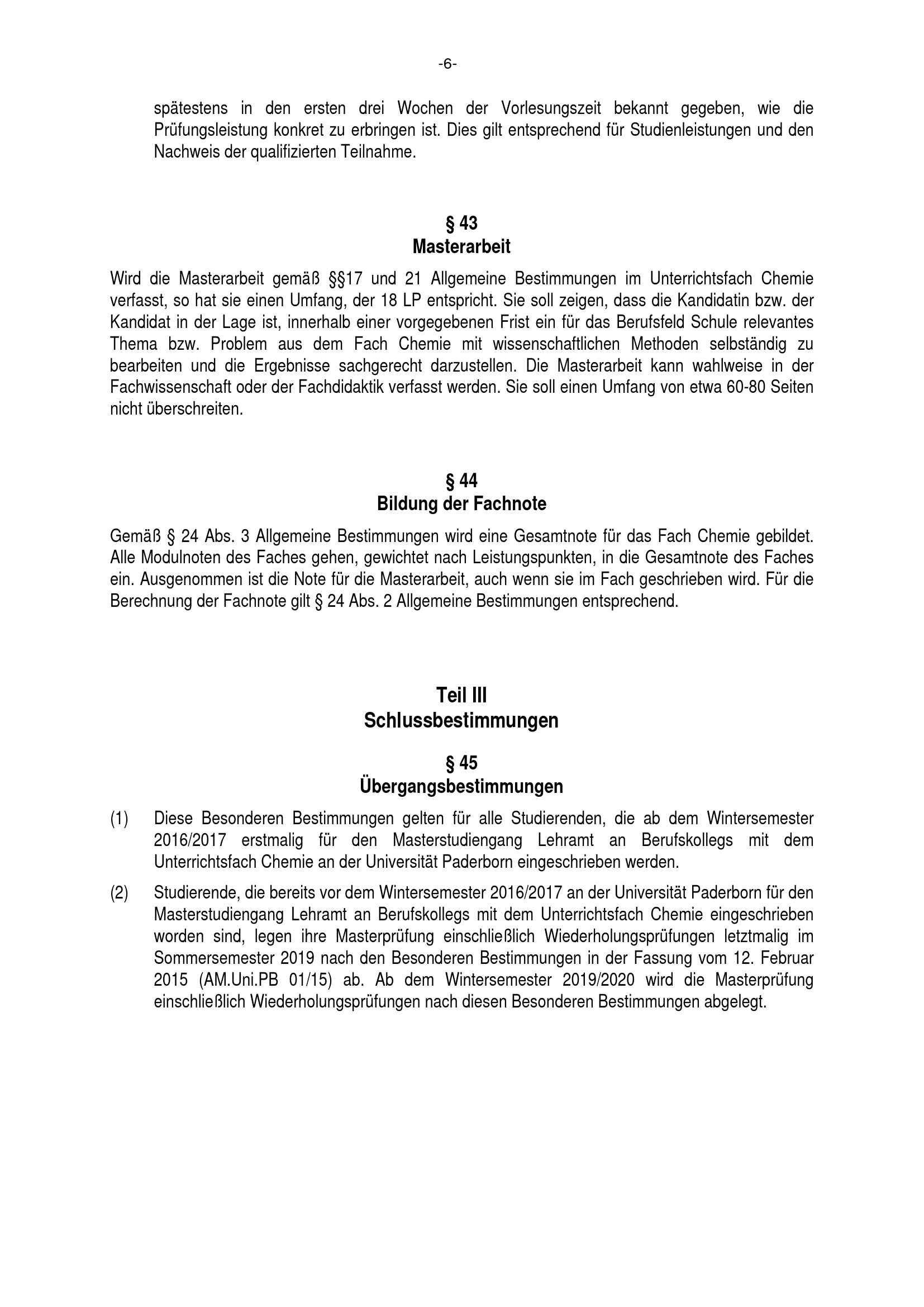 Besondere Bestimmungen der Prüfungsordnung für den Masterstudiengang Lehramt an Berufskollegs mit dem Unterrichtsfach Chemie an der Universität Paderborn : vom 22. Juli 2016