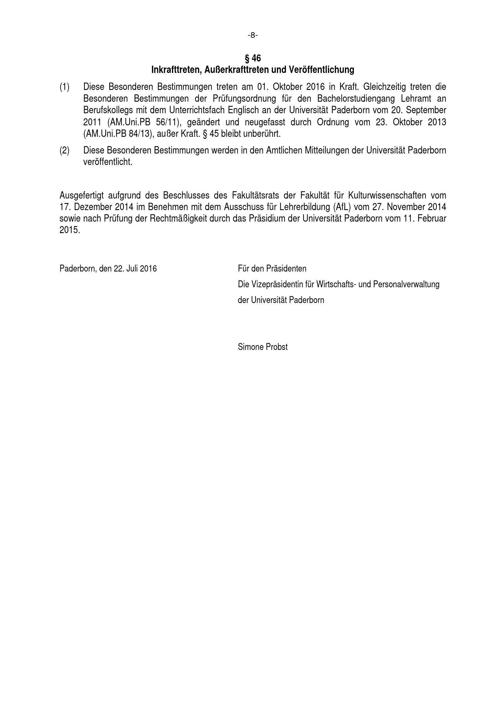 Besondere Bestimmungen der Prüfungsordnung für den Bachelorstudiengang Lehramt an Berufskollegs mit dem Unterrichtsfach Englisch an der Universität Paderborn : vom 22. Juli 2016