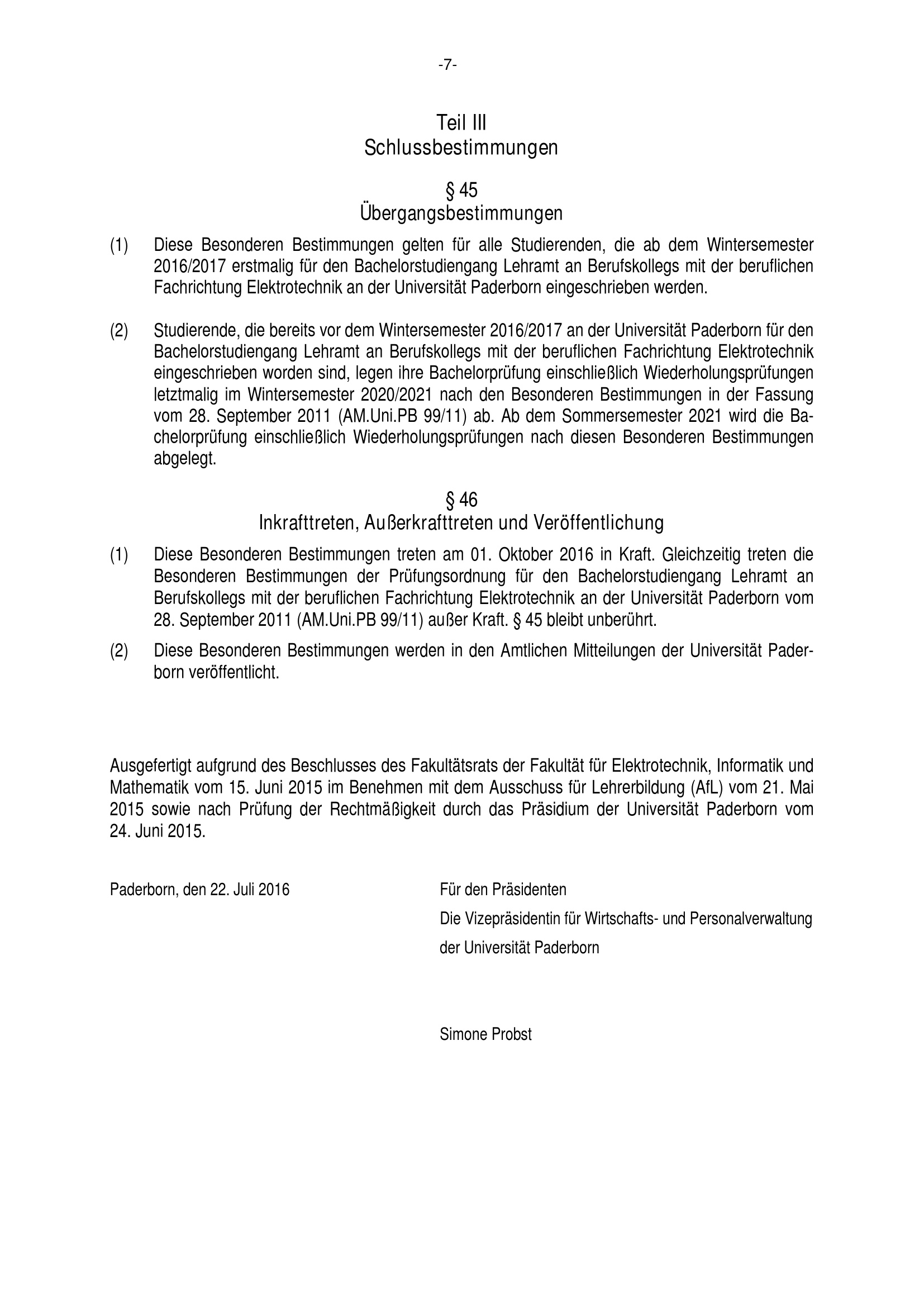 Besondere Bestimmungen der Prüfungsordnung für den Bachelorstudiengang Lehramt an Berufskollegs mit der beruflichen Fachrichtung Elektrotechnik an der Universität Paderborn : vom 22. Juli 2016