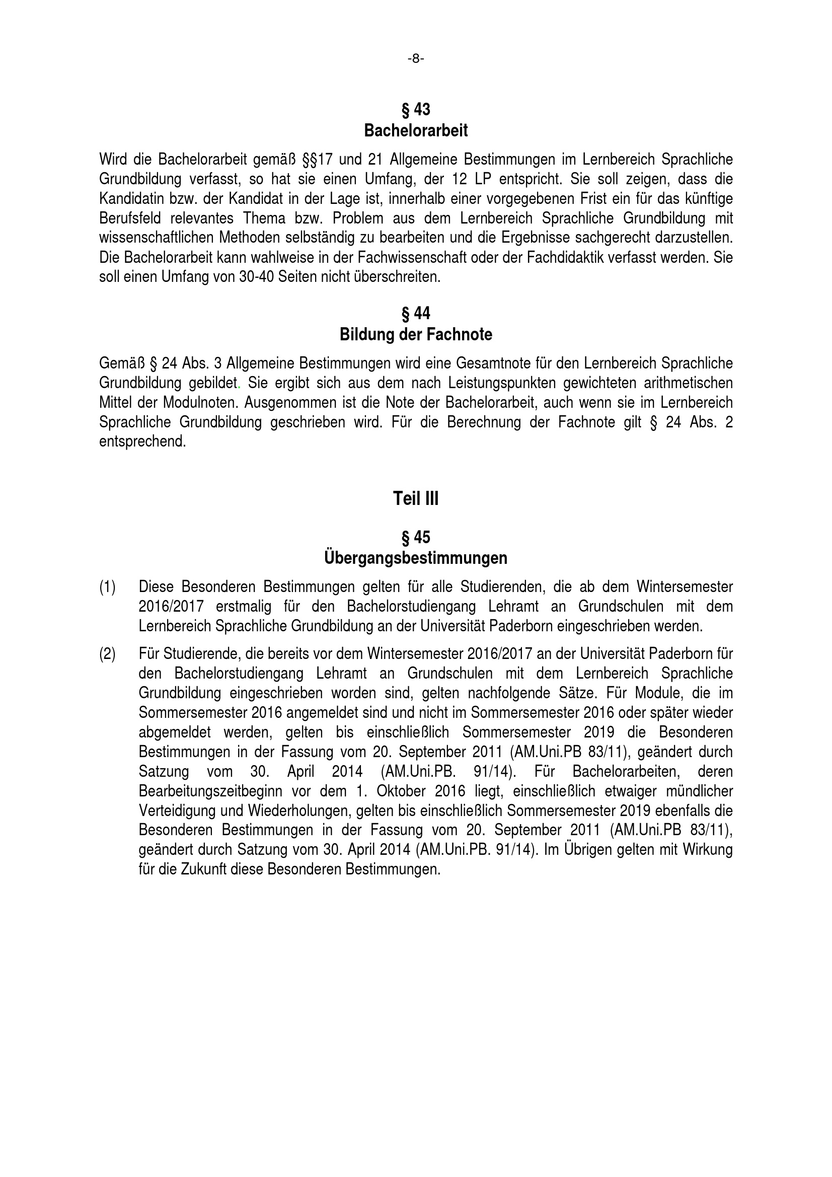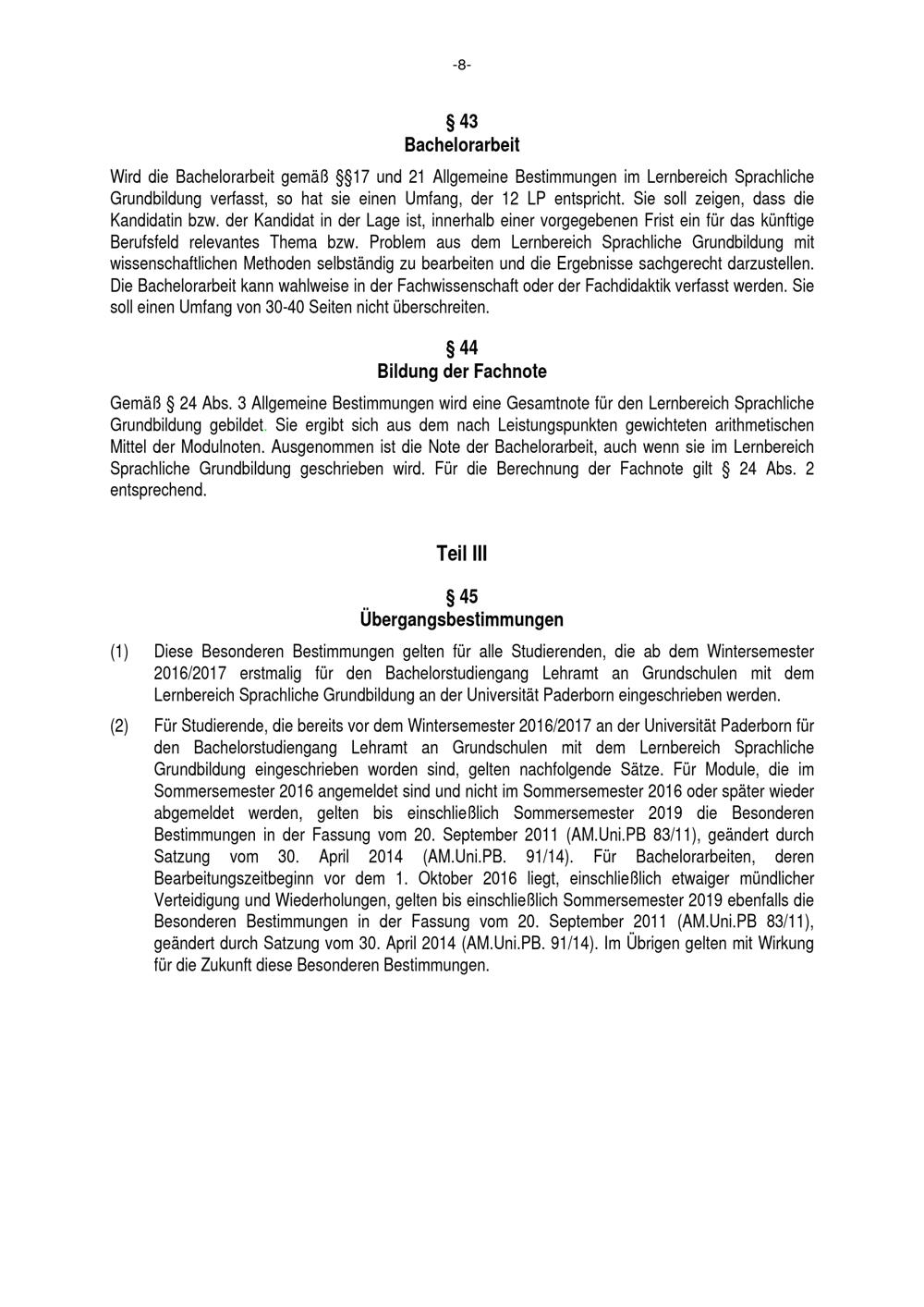 Besondere Bestimmungen der Prüfungsordnung für den Bachelorstudiengang Lehramt an Grundschulen mit dem Lernbereich Sprachliche Grundbildung an der Universität Paderborn : vom 22. Juli 2016
