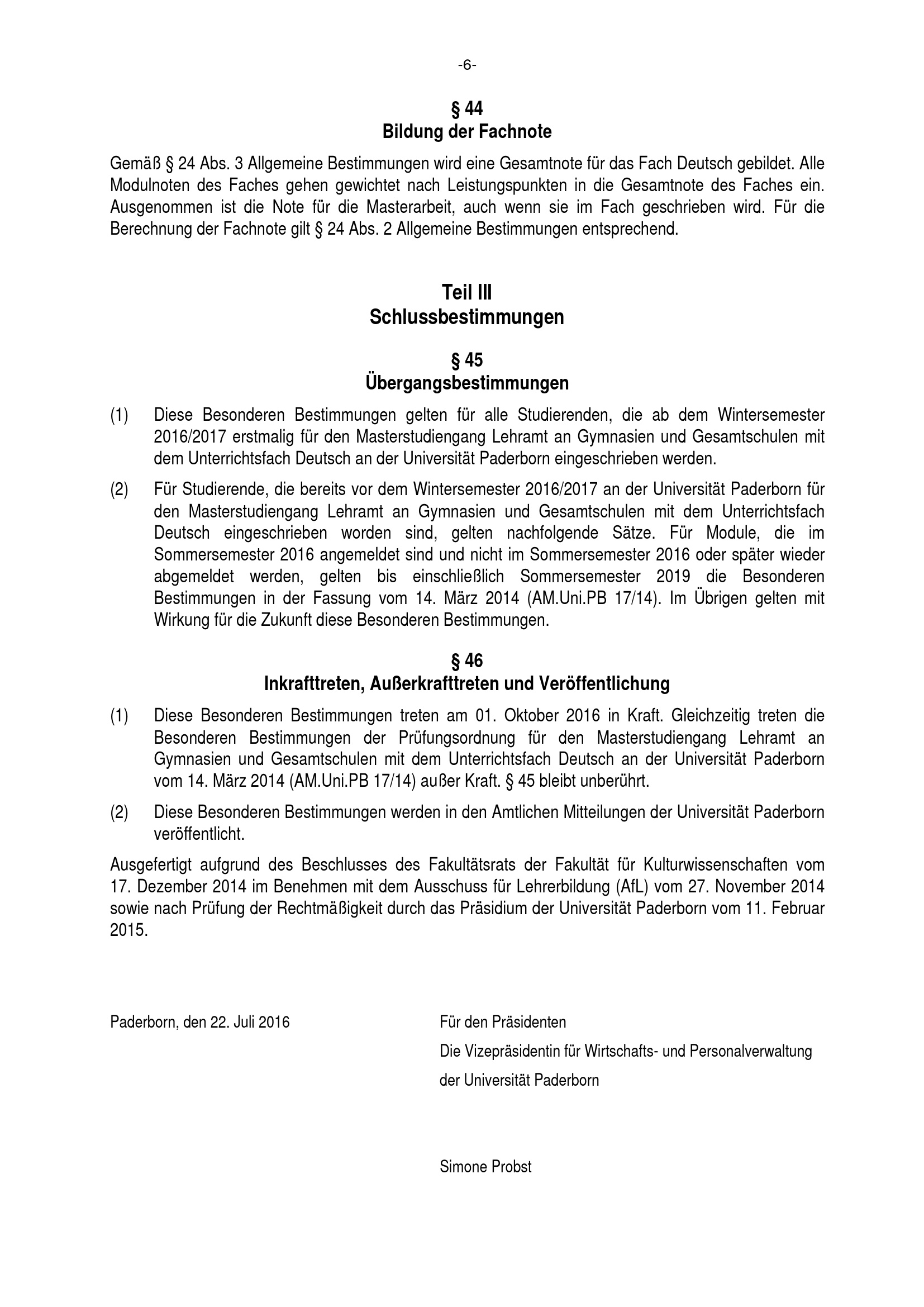 Besondere Bestimmungen der Prüfungsordnung für den Masterstudiengang Lehramt an Gymnasien und Gesamtschulen mit dem Unterrichtsfach Deutsch an der Universität Paderborn : vom 22. Juli 2016