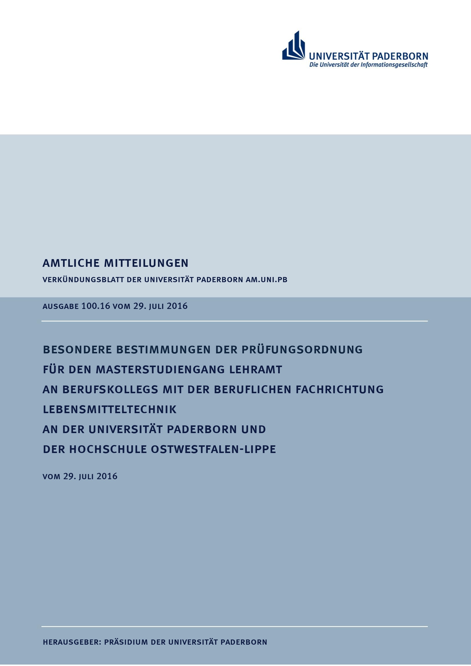 Besondere Bestimmungen der Prüfungsordnung für den Masterstudiengang Lehramt an Berufskollegs mit der beruflichen Fachrichtung Lebensmitteltechnik an der Universität Paderborn und der Hochschule Ostwestfalen-Lippe : vom 29. Juli 2016