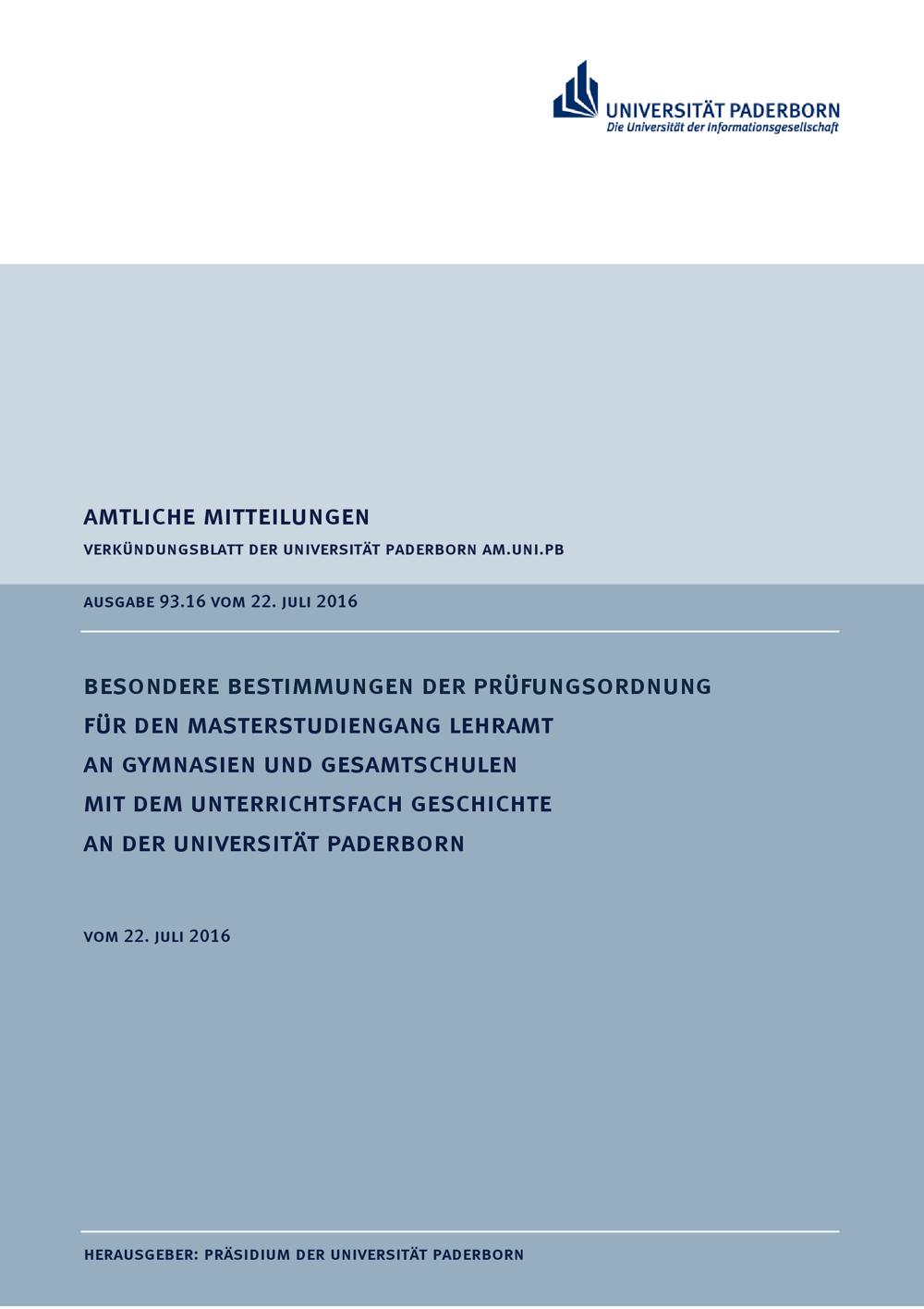 Besondere Bestimmungen der Prüfungsordnung für den Masterstudiengang Lehramt an Gymnasien und Gesamtschulen mit dem Unterrichtsfach Geschichte an der Universität Paderborn : vom 22. Juli 2016