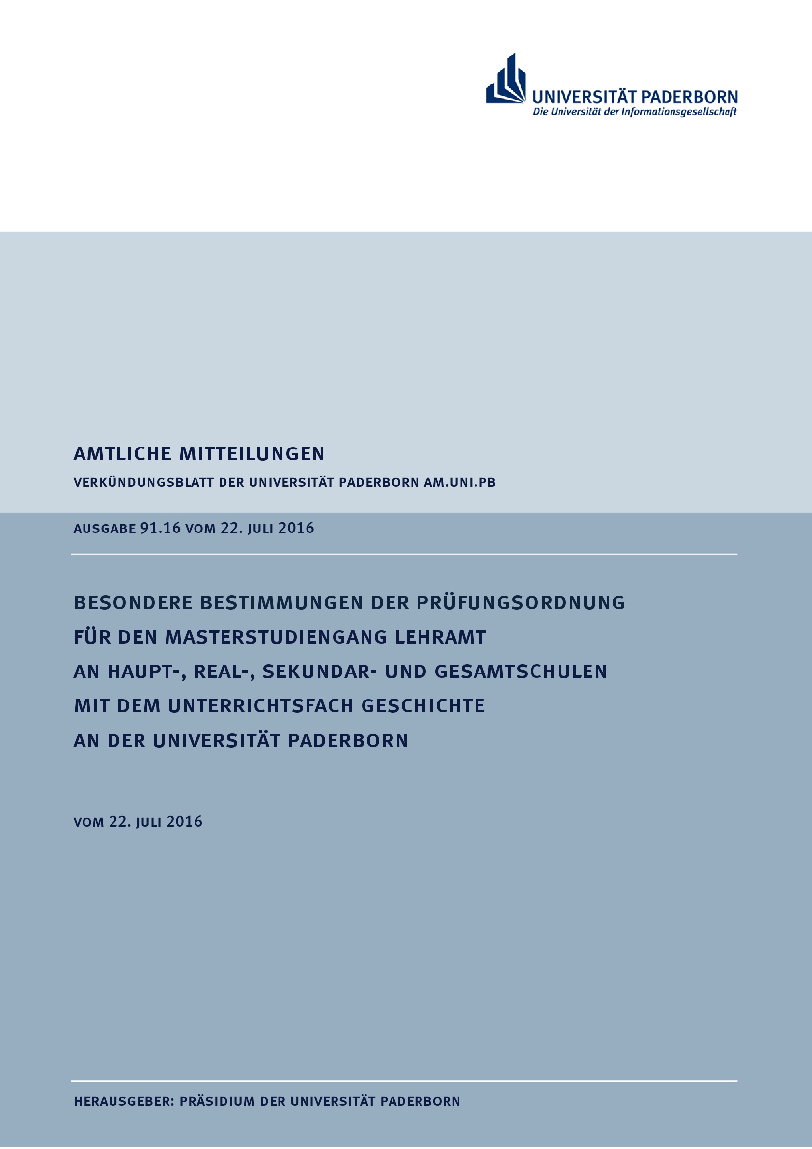 Besondere Bestimmungen der Prüfungsordnung für den Masterstudiengang Lehramt an Haupt-, Real-, Sekundar- und Gesamtschulen mit dem Unterrichtsfach Geschichte an der Universität Paderborn : vom 22. Juli 2016