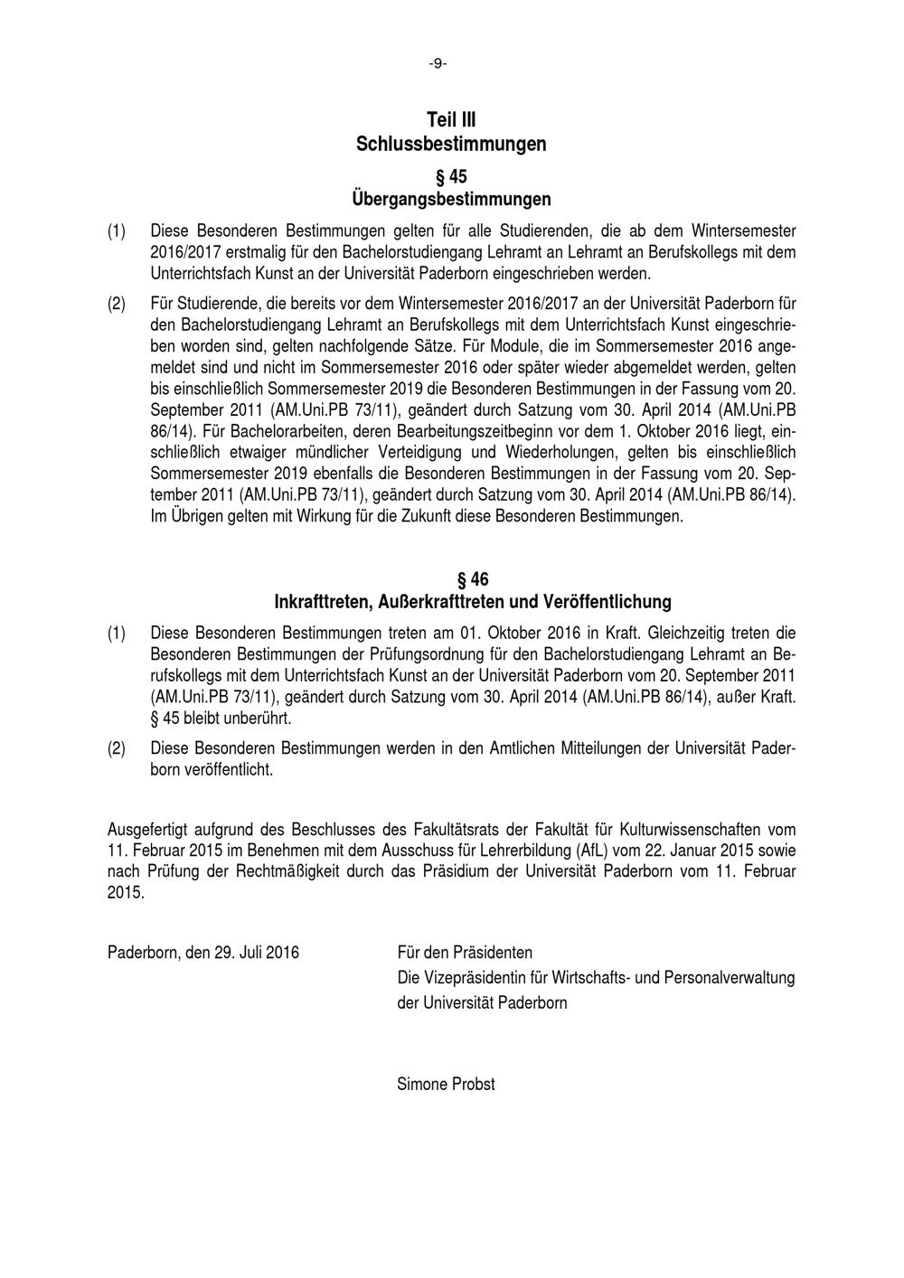Besondere Bestimmungen der Prüfungsordnung für den Bachelorstudiengang Lehramt an Berufskollegs mit dem Unterrichtsfach Kunst an der Universität Paderborn : vom 29. Juli 2016
