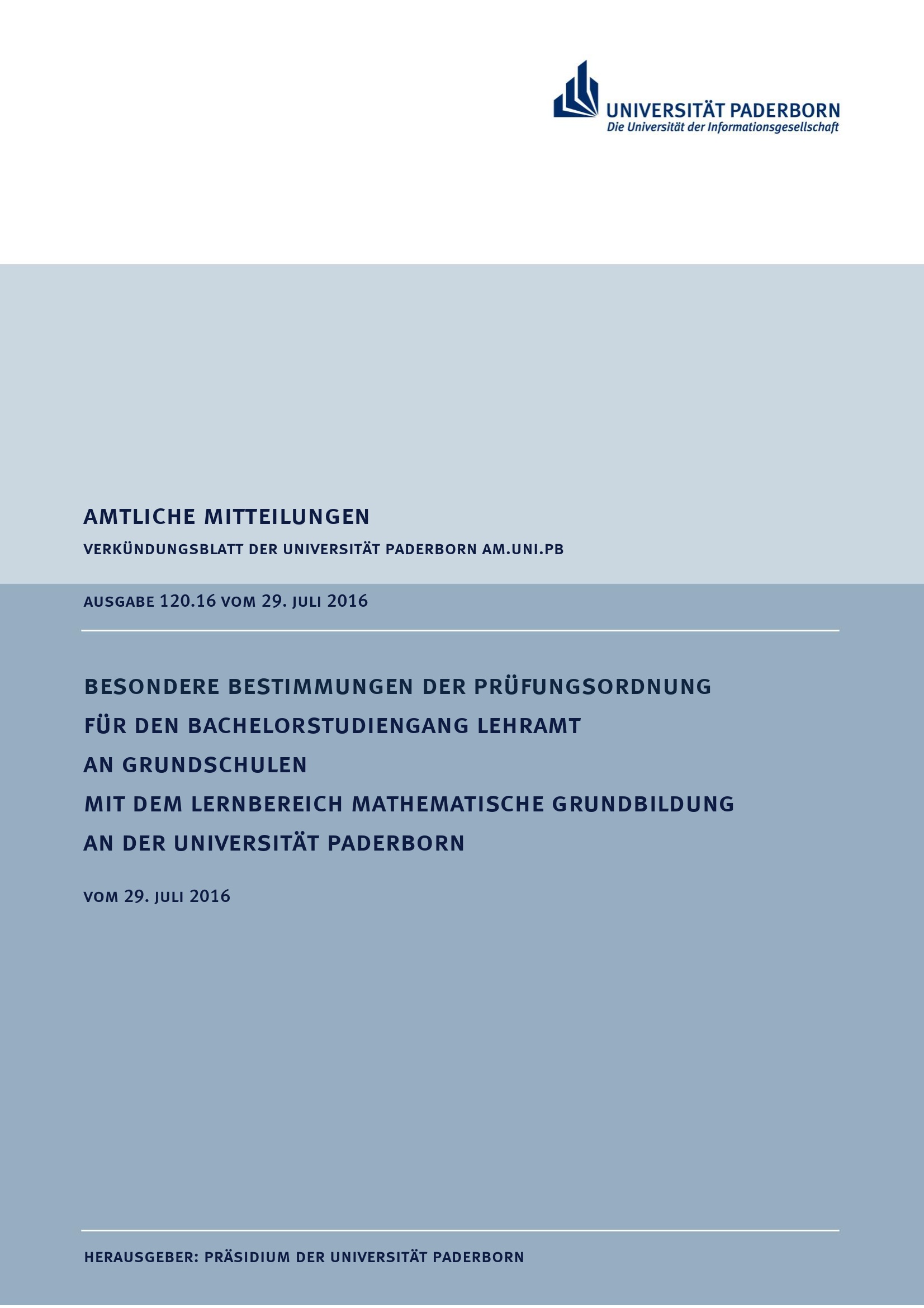 Besondere Bestimmungen der Prüfungsordnung für den Bachelorstudiengang Lehramt an Grundschulen mit dem Lernbereich Mathematische Grundbildung an der Universität Paderborn : vom 29. Juli 2016