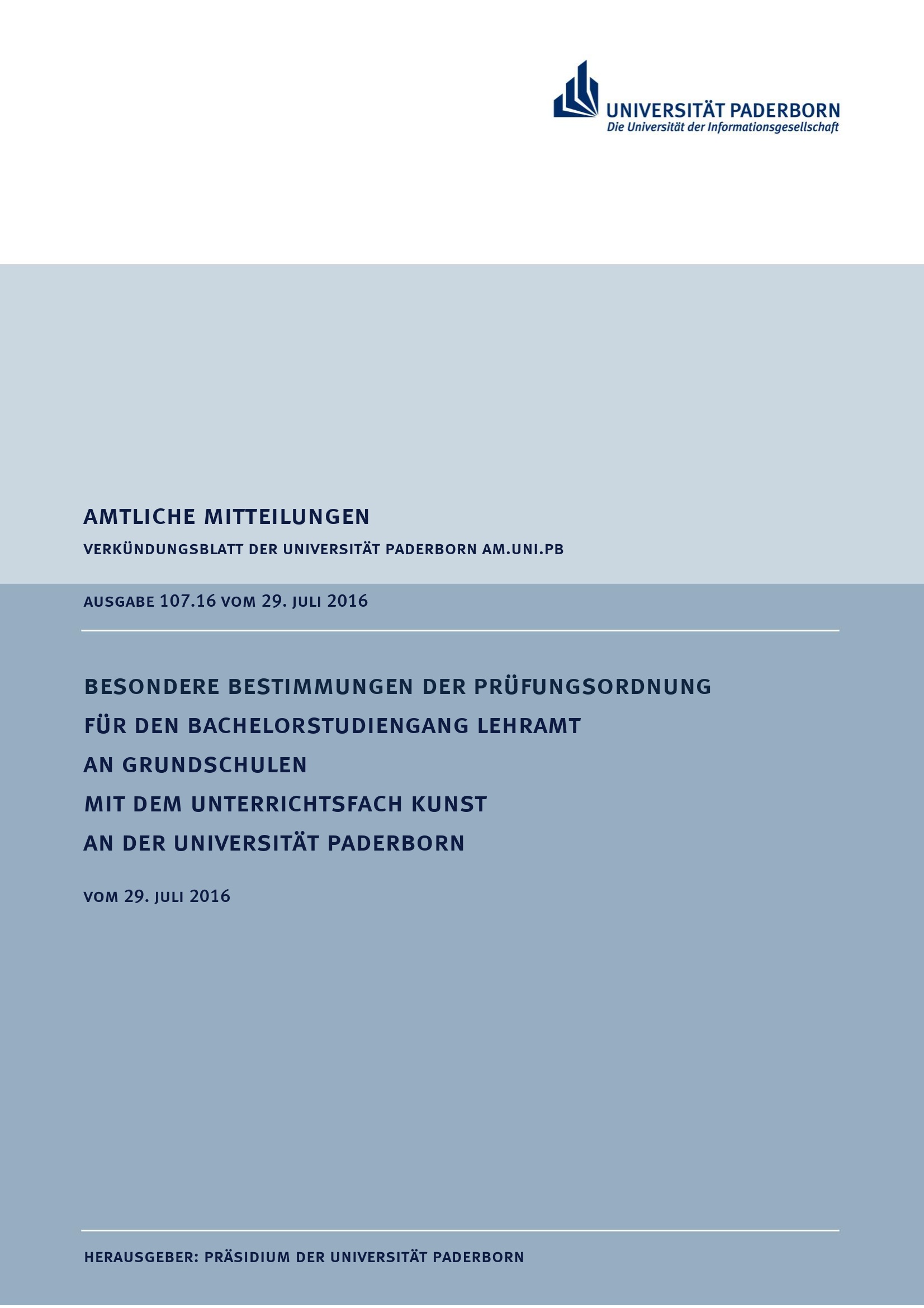 Besondere Bestimmungen der Prüfungsordnung für den Bachelorstudiengang Lehramt an Grundschulen mit dem Unterrichtsfach Kunst an der Universität Paderborn : vom 29. Juli 2016