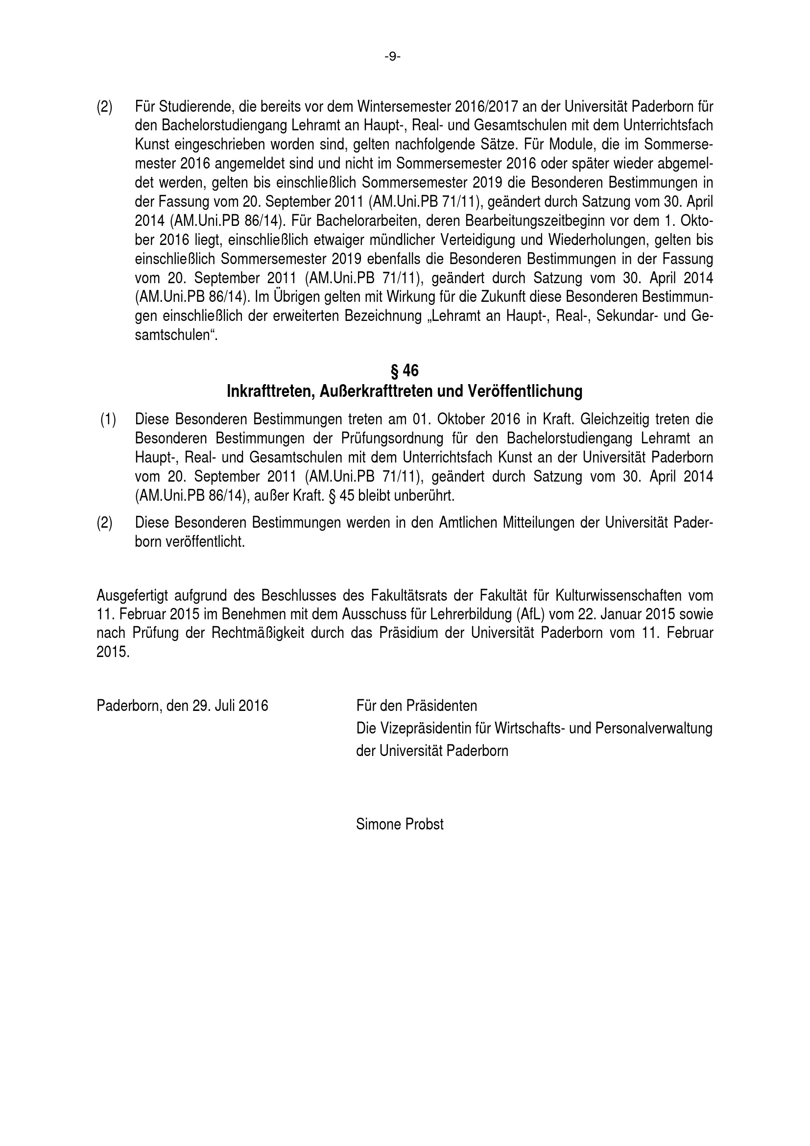 Besondere Bestimmungen der Prüfungsordnung für den Bachelorstudiengang Lehramt an Haupt-, Real-, Sekundar- und Gesamtschulen mit dem Unterrichtsfach Kunst an der Universität Paderborn : vom 29. Juli 2016