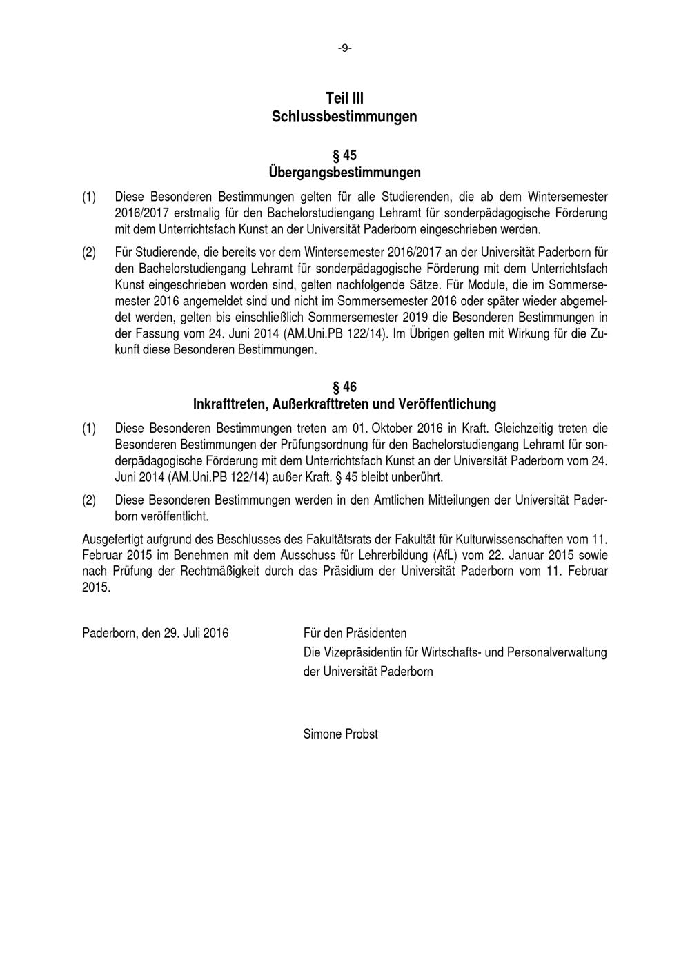 Besondere Bestimmungen der Prüfungsordnung für den Bachelorstudiengang Lehramt für sonderpädagogische Förderung mit dem Unterrichtsfach Kunst an der Universität Paderborn : vom 29. Juli 2016