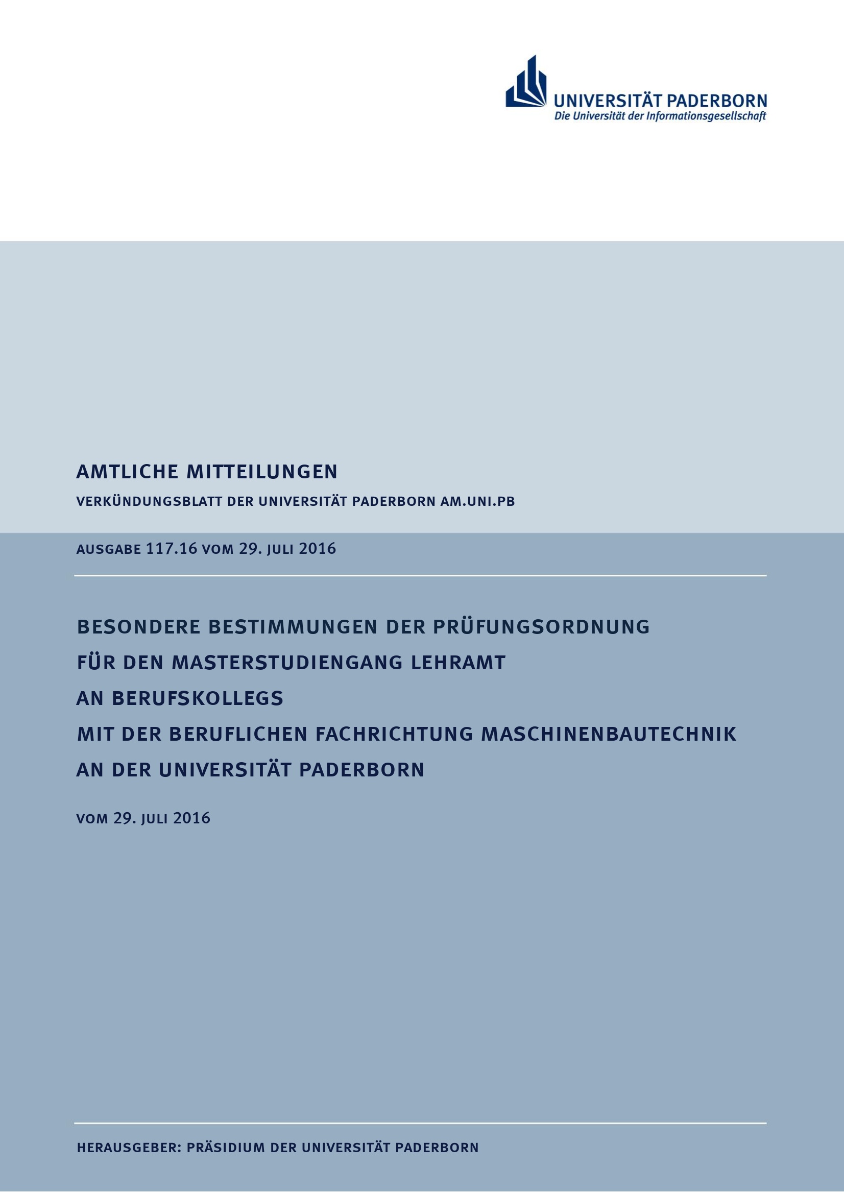 Besondere Bestimmungen der Prüfungsordnung für den Masterstudiengang Lehramt an Berufskollegs mit der beruflichen Fachrichtung Maschinenbautechnik an der Universität Paderborn : vom 29. Juli 2016
