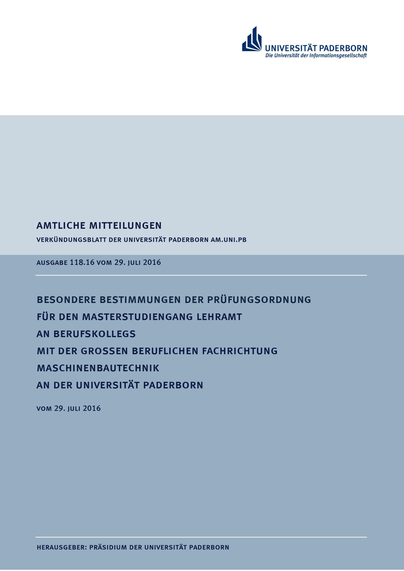 Besondere Bestimmungen der Prüfungsordnung für den Masterstudiengang Lehramt an Berufskollegs mit der Großen beruflichen Fachrichtung Maschinenbautechnik an der Universität Paderborn : vom 29. Juli 2016