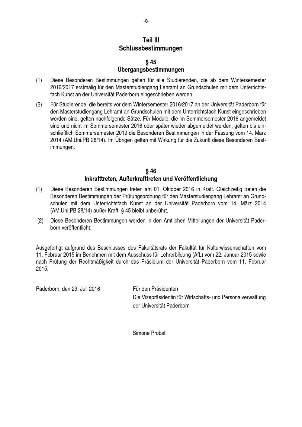 Besondere Bestimmungen der Prüfungsordnung für den Masterstudiengang Lehramt an Grundschulen mit dem Unterrichtsfach Kunst an der Universität Paderborn : vom 29. Juli 2016
